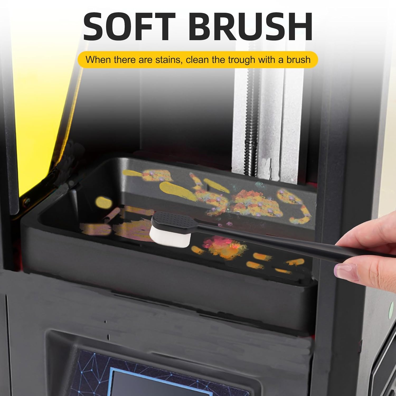 SOFT BRISTLE BRUSH:These brushes feature soft bristles, making them ideal for cleaning intricate details and hard-to-reach areas of printed parts. They can gently and thoroughly remove uncured resin residue without scratching or damaging printed parts, ensuring both detailed cleaning and object protection.