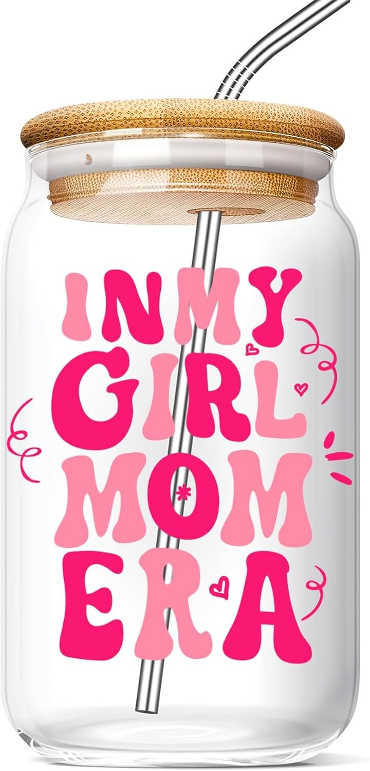 Cute cups for Girl Mom: Our “in my girl mom era” coffee glass cups with lids and straws are great for moms of girls; If you know a soon-to-be mother of a girl or a mother who already has girls, this cup could be a fun and practical present to celebrate her journey or experience of raising girls; Thoughtful gifts for girl mom, mom of girls, new mom, expecting mom, first time mom, mom to be, promoted to girl mom.
