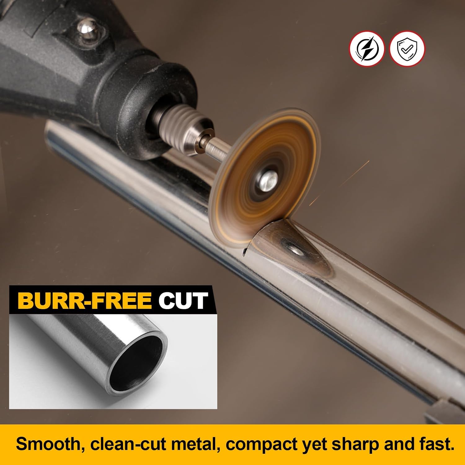 ADAPTABILITY AND CONVENIENT SPECIFICATIONS: The cut off wheels is equipped with 2 adapted 1/8-inch shafts, which is designed to work seamlessly with most rotary tools. At the same time, the maximum speed of 45,000 rpm ensures cutting efficiency and quality for a wide range of cutting tasks