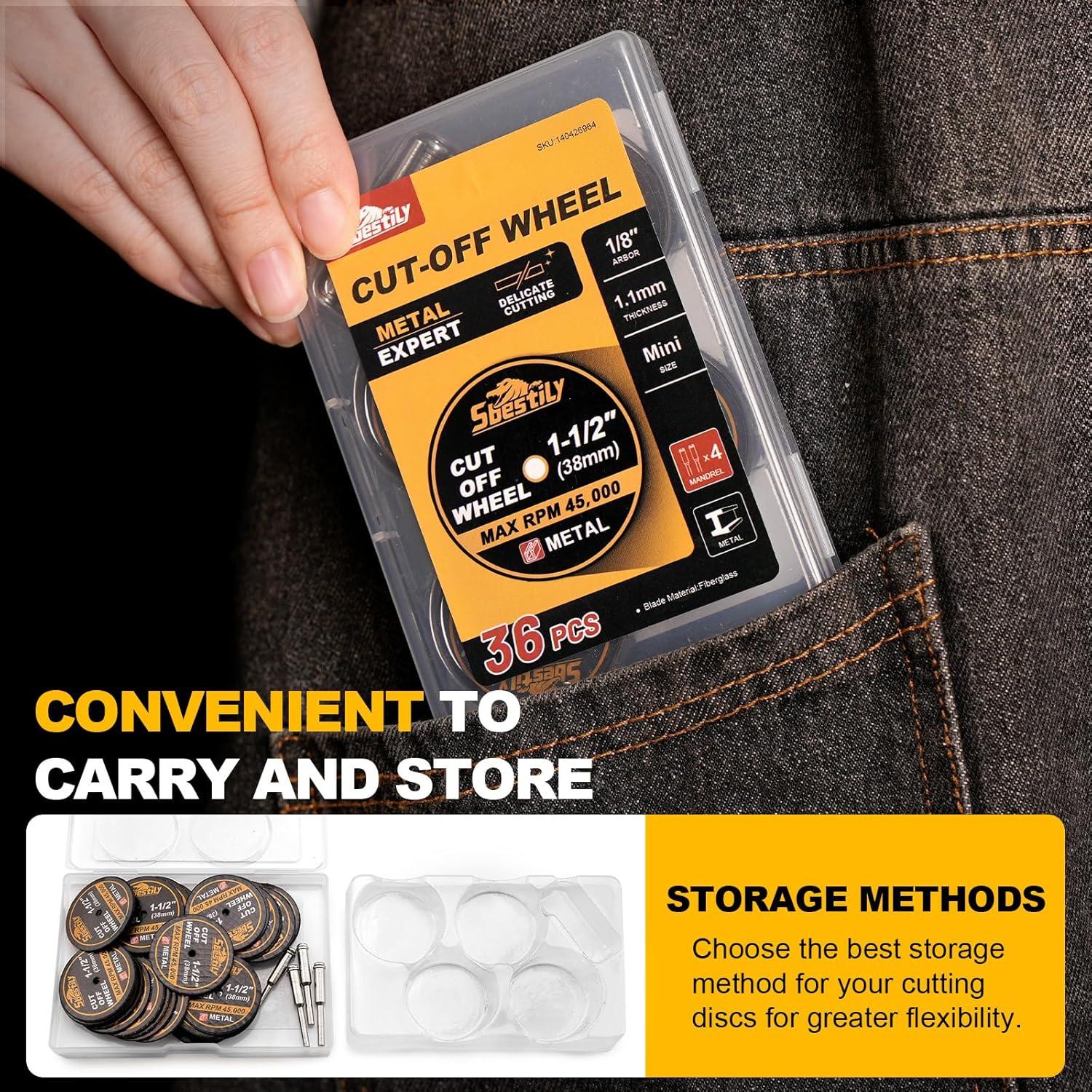 This is a review for the SBESTILY – 1-1/2 Cut Off Wheels,BUILD:This kit come with 32 cutting wheels and 4 mounting posts. The cutting disc’s themselves are made of fiberglass mesh with resin and coarse sand.The kit also comes with four (4) generic mounting posts that use a screw style attachment at the top.The kit also comes with a small case to keep everything neatly organized.USE:These cutting wheels are designed to use with rotary tools but are not specific to any brand. They are used to cut or trim metal of varying toughness and thickness within the limits of the tools design.They’re designed for use with a 1/8 inch arbor.The cutting wheels are mounted to one of the four included mounting posts in the kit. By unscrewing the top screw and removing it , you can then thread the screw through the hole of the disc and re-attach the screw to the other section of the mounting post.Is disks have a maximum speed usage of 35,000 RPMSUMMARY:I found these cutting discs to be versatile and effective for most rotary tool applications. While they do cut very well, you should know that their effectiveness depends on what you are cutting. If you are cutting or trimming thin sheet aluminum, this won’t be a problem. If you’re trying to cut stainless steel, then I would definitely buckle up.While I prefer the locking style compression fittings for these kind of tools, the standard screw mounting works perfectly fine here. These disc’s will not function with some proprietary mounting styles like the “hour glass” compresson fitting of some name brand rotary tools.These worked very well with my name brand rotary tool , and I found them to be effective for the use that I bought them for. In my case, there were some lug nuts on my vehicle that feature a double layer beauty cap. They, unfortunately swelled, and I wasn’t able to get the lug nut off without rotating just the beauty cap portion. I was forced to cut these beauty caps off using a rotary tool and these cutting discs. The beauty cap cover was made of a thinner tin like metal and it cut right through it with no issue.While these disc’s do wear out over time, the kit gives you 32 of them so that should get you through numerous projects depending on their scope.If you’re looking for a nice kit of cutting disks that are relatively inexpensive, this is a really good buy.