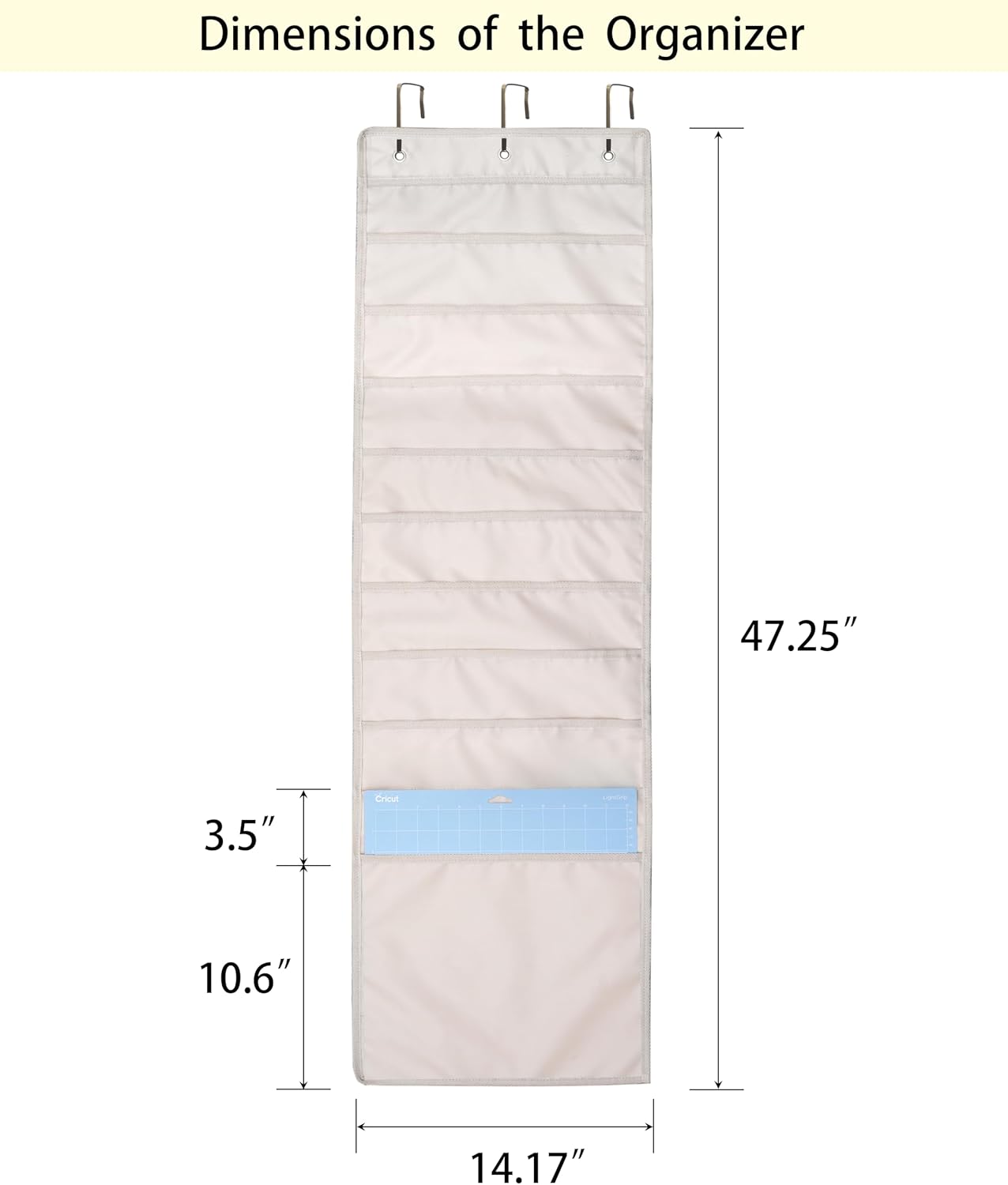 I bought this organizer to help manage my craft supplies, especially things like Cricut mats, cutting boards, measuring rulers, and embroidery hoops. It’s been a great way to get things off my workspace and onto the back of a door, where everything is still easy to see and grab.What I really like is that the pockets are deeper than many other over-the-door organizers I’ve tried. They’re perfect for things like rulers and paper stacks. However, they’re still not quite deep enough to hold the extra-long Cricut mats upright on their own. To fix that, I clipped mine in place using a few small craft clamps, which keeps them from leaning or falling forward. Placing my long rulers in front of my mats also keeps them upright. Those simple tricks made a big difference.One thing I didn’t love was the included over-the-door hooks. I’ve had issues with those in the past scratching and damaging my doors, especially when you put weight on them. This time, we chose to screw the organizer directly into the back of the door. Personally, I think patching a couple of small holes later is way easier than trying to repair damage to the edge of a door. It also feels a lot more stable this way.The organizer arrived in a clear plastic bag inside a regular Amazon box. It was folded flat, and while there were a few creases from shipping, those smoothed out after a day or two of hanging. The material feels durable, and the stitching around the pockets is strong. So far, it’s held up really well even with heavier items like cutting boards bigger rulers.The only reason I’m giving this four stars instead of five is because I wish the pockets were just a bit deeper for longer items, and I really wish it came with a better mounting options or a warning about what over-the-door hooks can do to the top of your door and your trim. But with a few small adjustments, this has been a very functional and affordable solution for organizing my craft supplies.