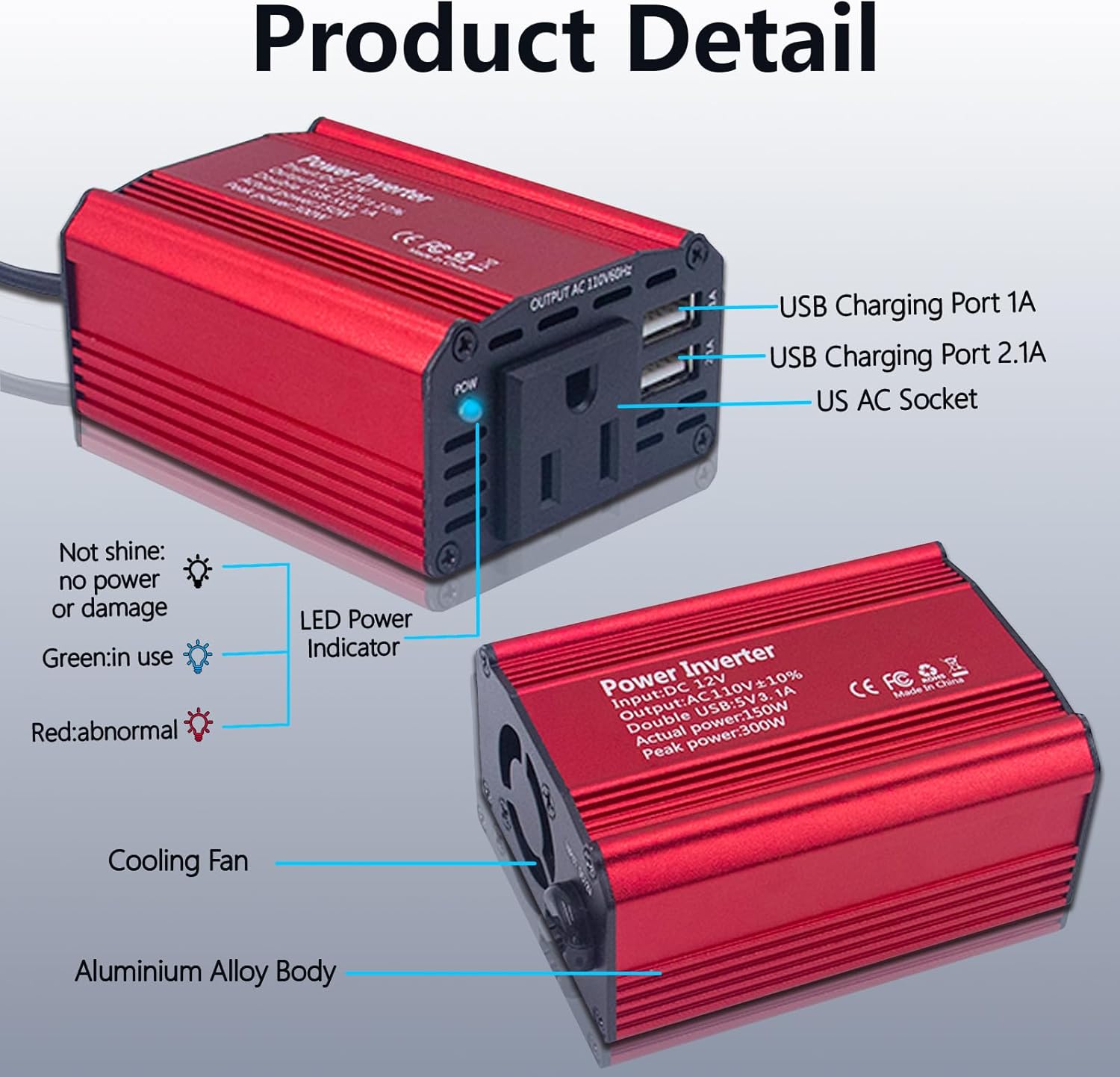 [150W Car Inverter] Car Power Inverter features 1 AC outlet and 2 USB-A ports, Converting 12V DC to 110V AC, Suitable for laptops, tablets, smartphones, breast pumps, gaming consoles, CPAP machines, Christmas gifts, light strings,and so on.