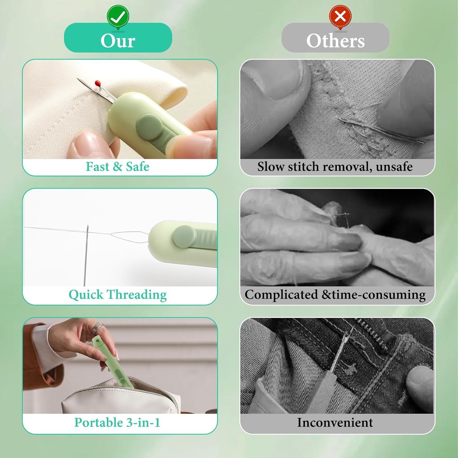 My wife likes to sew so I ordered this tool for her because as she says, “you can never have enough seam rippers”. But after trying it out, she convinced that it’s a really useful tool. In fact, she’s quite sold on it.From what I can tell, this is a 3 in 1 sewing gizmo that fits several tools (that you would normally buy separately) into one convenient package.Tucked into a single cute green case is a seam ripper, a needle threader, and even a clever little compartment for storing and transporting needles. Both the seam ripper and the needle threader extend and lock into place for easy use, then retract out of the way when your work is finished. But even more important is that my boss says the gizmo is a comfortable size and easy to hold so that you can use it for an extended time without it hurting your hand.It’s important to note that the seam ripper or the threader is no different or better than the ones sold individually, but what makes this tool stand out, she says, is the fact that these three tools are contained in one simple easy to use package and in her book that spells convenience.As far as she’s concerned, this product is a winner.Five stars she says.