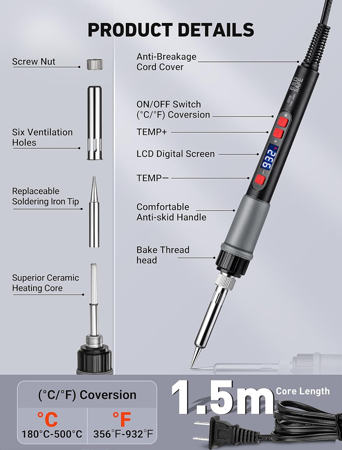 【Rapid Heating & Precise Control】 Features a 60W ceramic heating core for fast heating. The high-definition LCD screen displays clear temperature (180°C-500°C/356°F-932°F, °C/°F switchable). Four ventilation holes ensure efficient heat dissipation for safe operation.