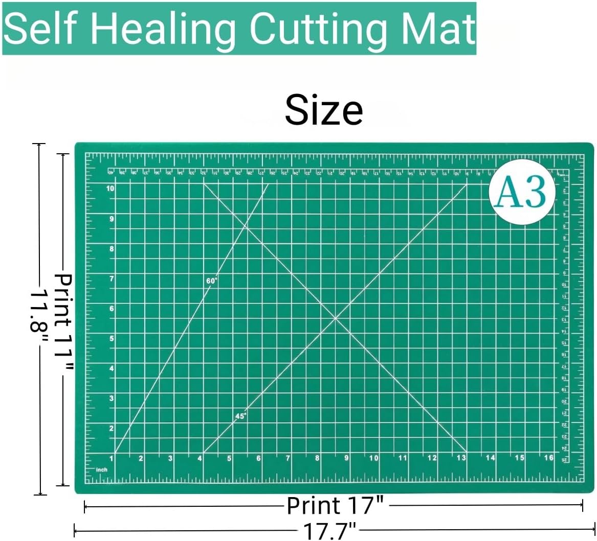 Self Healing Sewing Cutting Mat- Double sided rotary cutting mat made of 5-Ply PVC material, grid print on both sides, Imperial and Metric, compatible with rotary cutter to protect your work surface, tabletop and rotary blades. Fabric cutting mat size is A3(45cm×30cm), grid size of print is 17″ x 11″, perfect for small&medium craft and sewing projects.