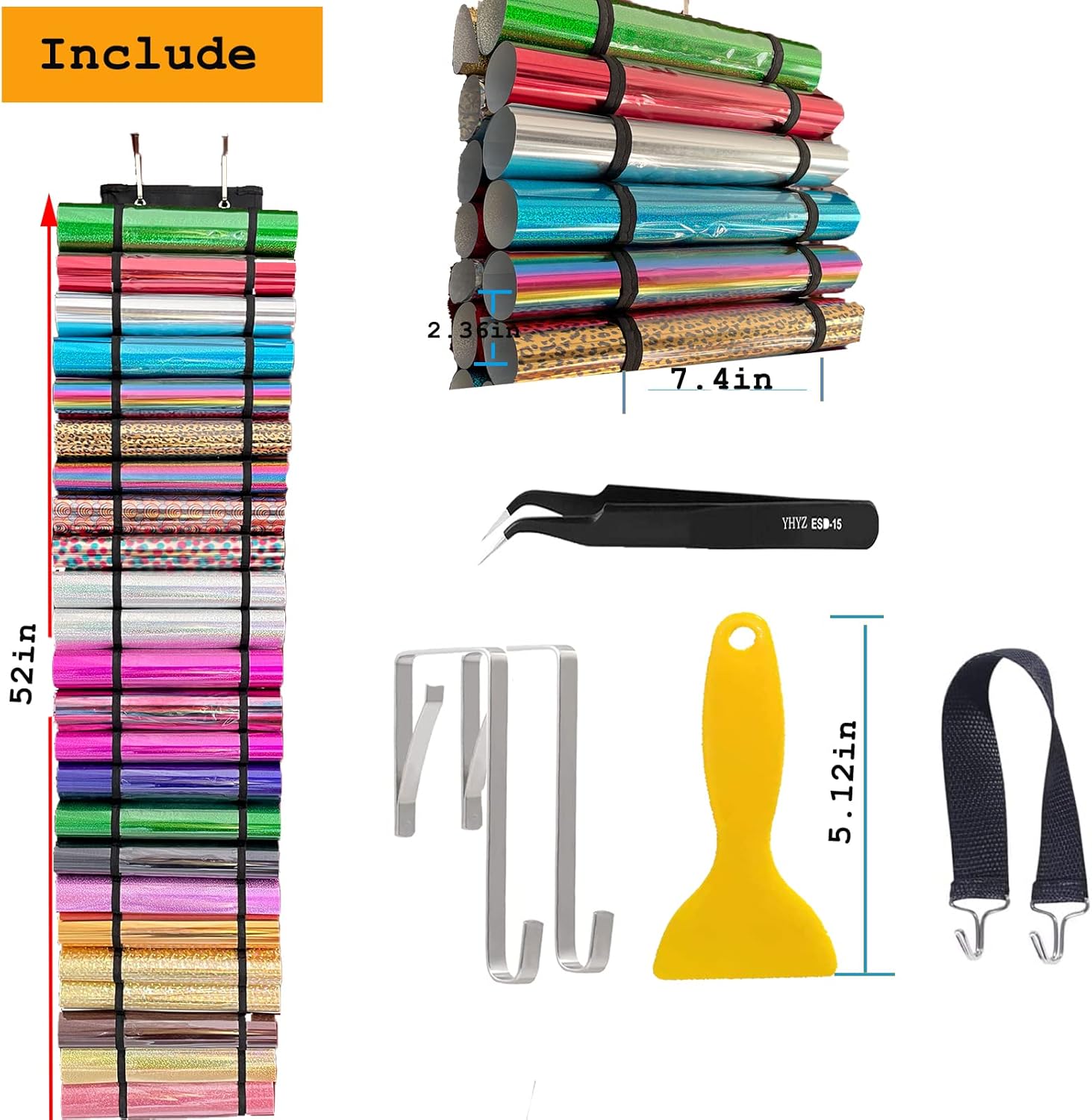 【Save Space】This Vinyl rolls holder come with a 10in strap and 2 door hooks. You can hang them on the wall or closet or door. No need to take up any additional space.
