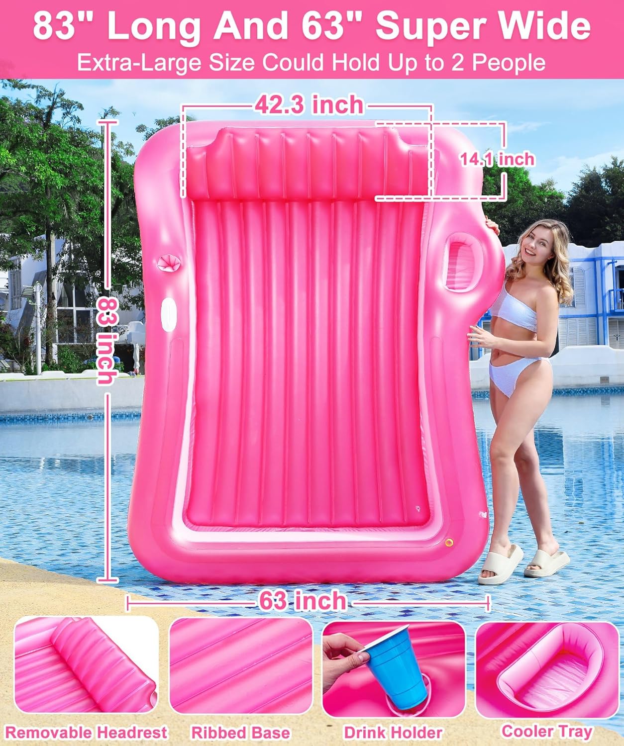 Comfortable Pink Tanning Pool: Includes one 83”x63”extra large inflatable suntan pool lounger featuring an inflatable base for extra comfort, 1 drink holder, 1 Cooler Tray, a removable headrest and a hose cover; The carry handle makes it easy to use