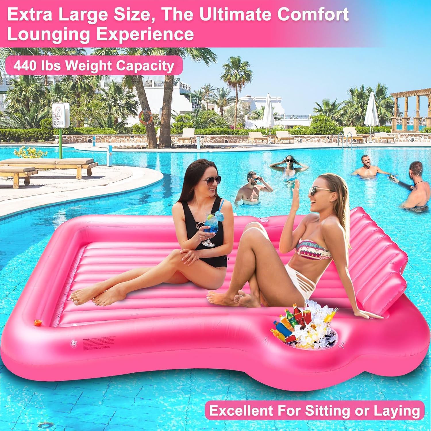 Comfortable Pink Tanning Pool: Includes one 83”x63”extra large inflatable suntan pool lounger featuring an inflatable base for extra comfort, 1 drink holder, 1 Cooler Tray, a removable headrest and a hose cover; The carry handle makes it easy to use