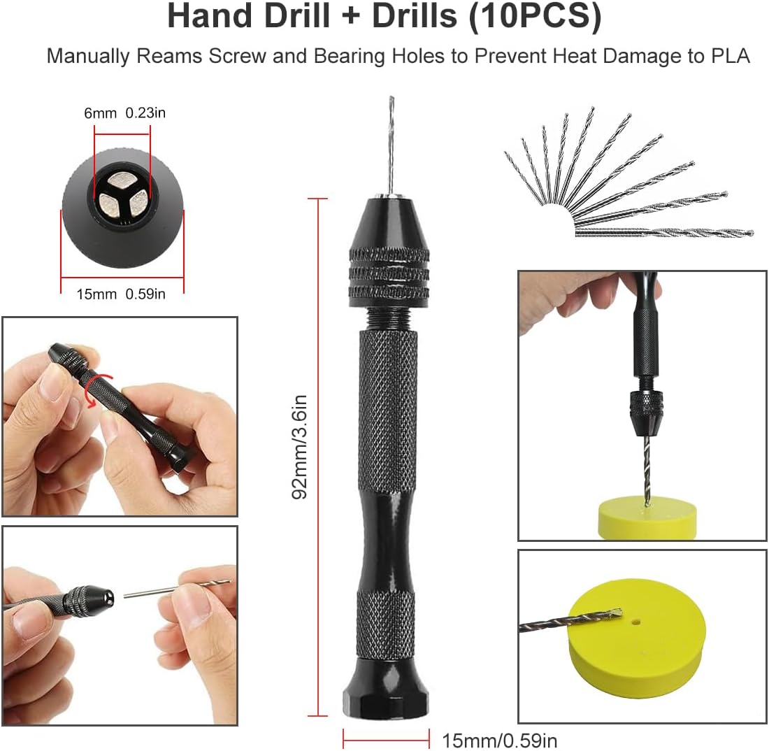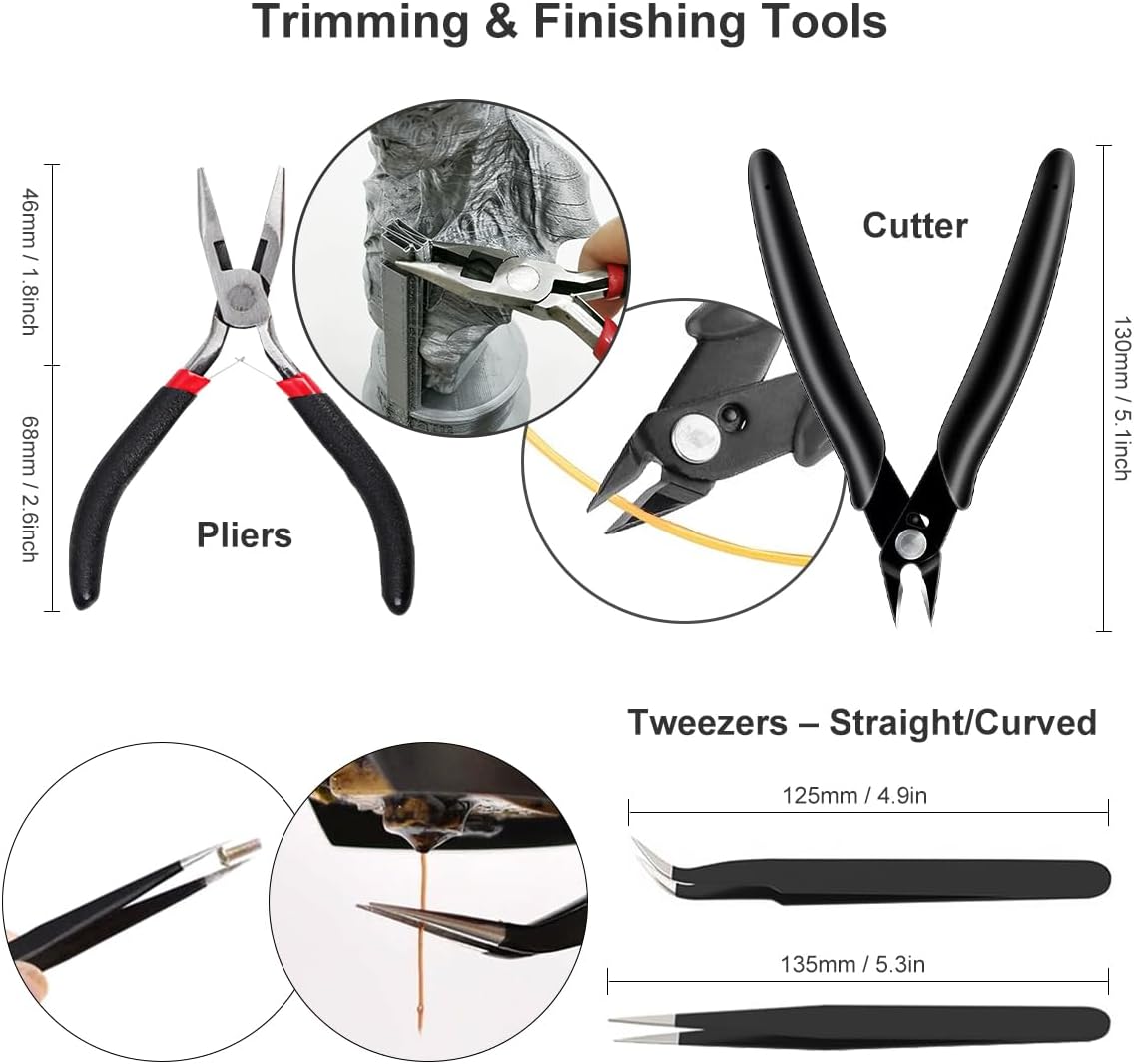 Precision Cutting & Trimming Tools. Achieve surgical-grade precision with our 3D printer tool kit, featuring heavy-duty wire and filament cutters and needle-nose pliers for flawless support removal. The Craft Knife Set and Deburring Tools for both rough cuts and delicate detailing. Perfect your creations with the included hand drill bits set – ideal for making precise holes and modifications. This comprehensive 3D printing cutting tools collection ensures you have the right print finishing tools for every project, from basic cleanup to professional-grade model refinement.