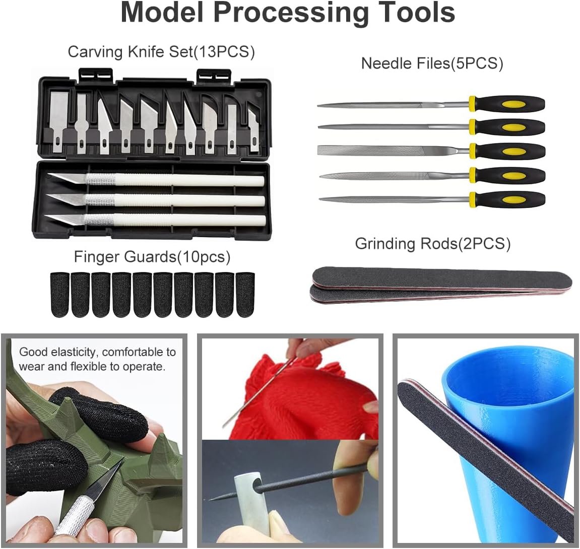 Effortless Print Cleaning & Surface Prep. Tackle even the most stubborn filament with our professional-grade 3D printing tools featuring dual scrapers (plastic + stainless steel) – the ultimate removal tools for PLA, ABS, and PETG. Achieve museum-quality finishes precision files and sanding sticks, specially designed as model tools for post-processing. The included cut-resistant gloves provide superior protection during intensive cleanup sessions, making this the smartest choice for both 3D printing maintenance and model finishing tools.