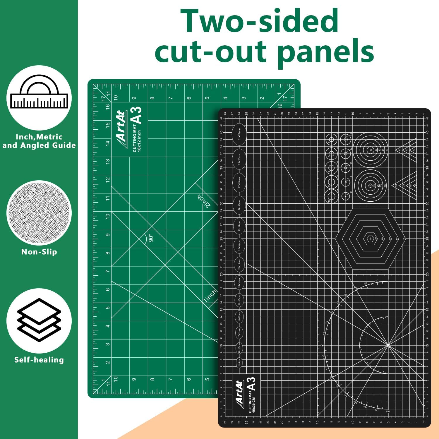 【A3 CUTTING MAT】Our cutting mat boasts a durable 5-ply self-healing design, complete with 1/2″ grid and 1/8″ marks for precise alignment, 30° 45° 60° 90° guides, and diagonal cutting lines.