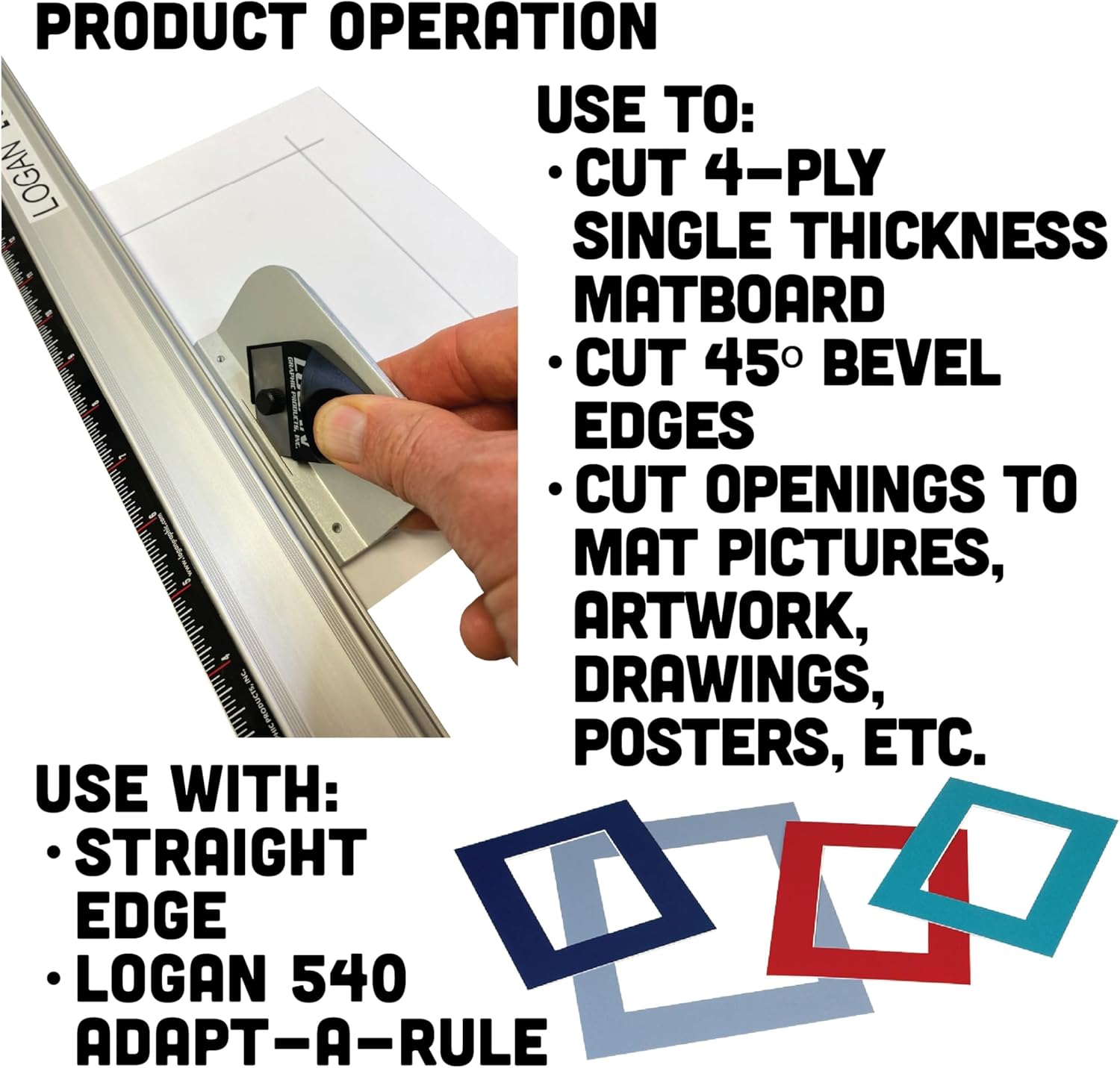 The Logan Push Style handheld bevel cutter features a retractable blade and a unique blade slot that prevents blade flex, ensuring straight cuts. It includes a start and stop indicator to help eliminate overcuts. This cutter can be used against any suitable straight edge and can be upgraded for compatibility with Adapt-a-Rule, Compact, Artist Elite, and Simplex series.