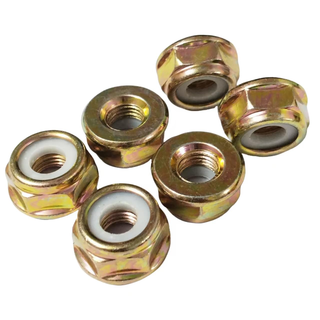 This 6-piece blade nut set features M10×1.25 left-hand threaded flange nuts, serving as practical replacement parts for lawn mowers, trimmers, and other cutting machines