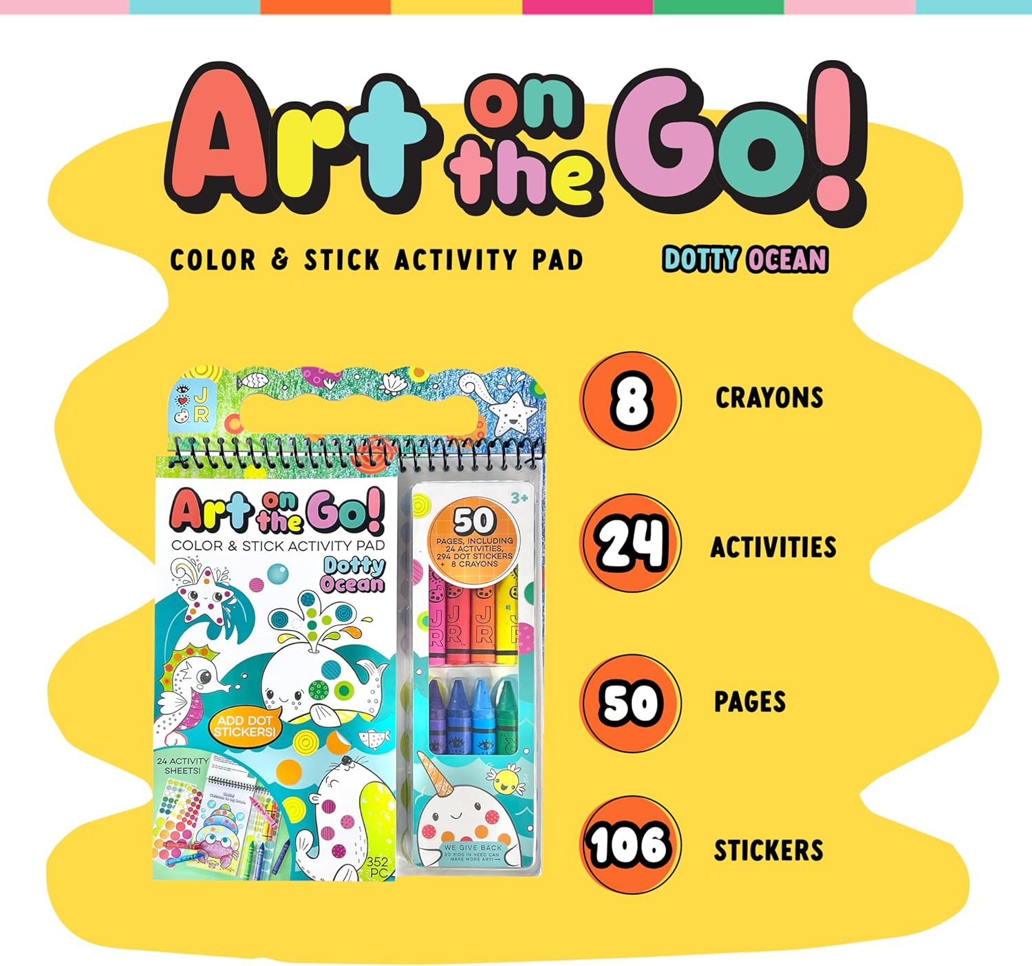 All-in-One Artistic Experience – Includes themed 50 pages including 24 activities, 294 dot stickers, and 8 chunky crayons so children can color, create and invent endlessly wherever they are.