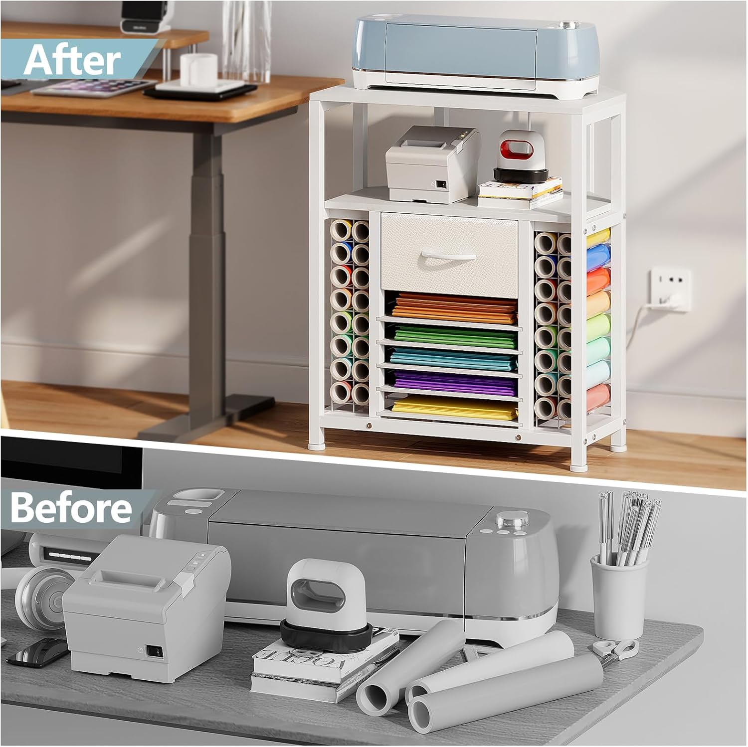 Ample Storage for Craft Supplies—Includes 1 fabric drawer for storing tools and accessories, a vinyl roll holder that fits up to 32 rolls, and 5-tier shelves for A4 paper, materials—perfect for keeping your craft room neat and organized.