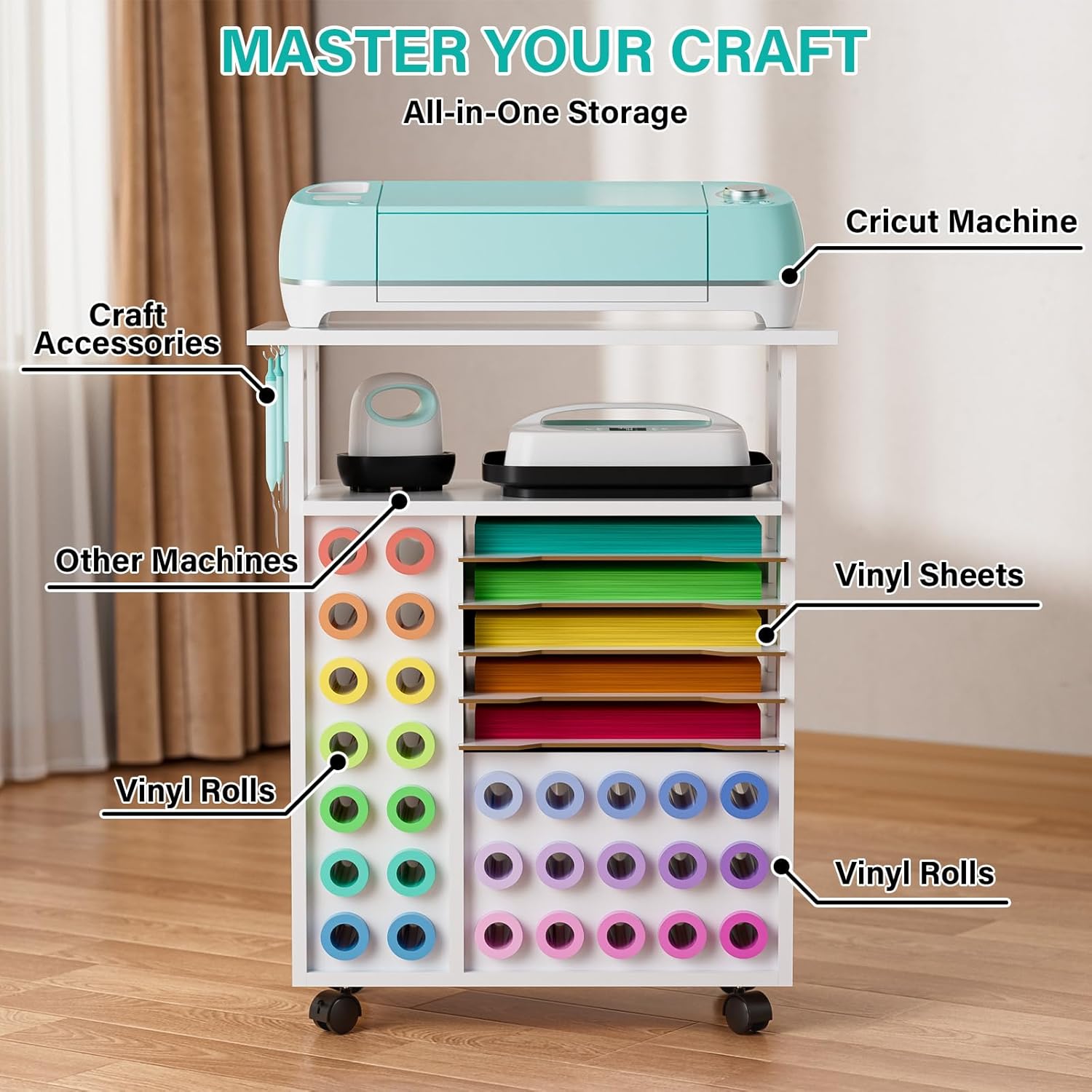 Very sturdy cart for a cricut machine, vinyl and crafting supplies. It took 45 minutes to put together and holds 29 rolls of vinyl and has 4 shelves that can be used for vinyl sheets. I utilized the shelves to put my vinyl rolls for a total of 44 rolls as pictured. However, it can hold more rolls with using the shelving area. The cart is on wheels making it easy to move. I highly recommend this cart.