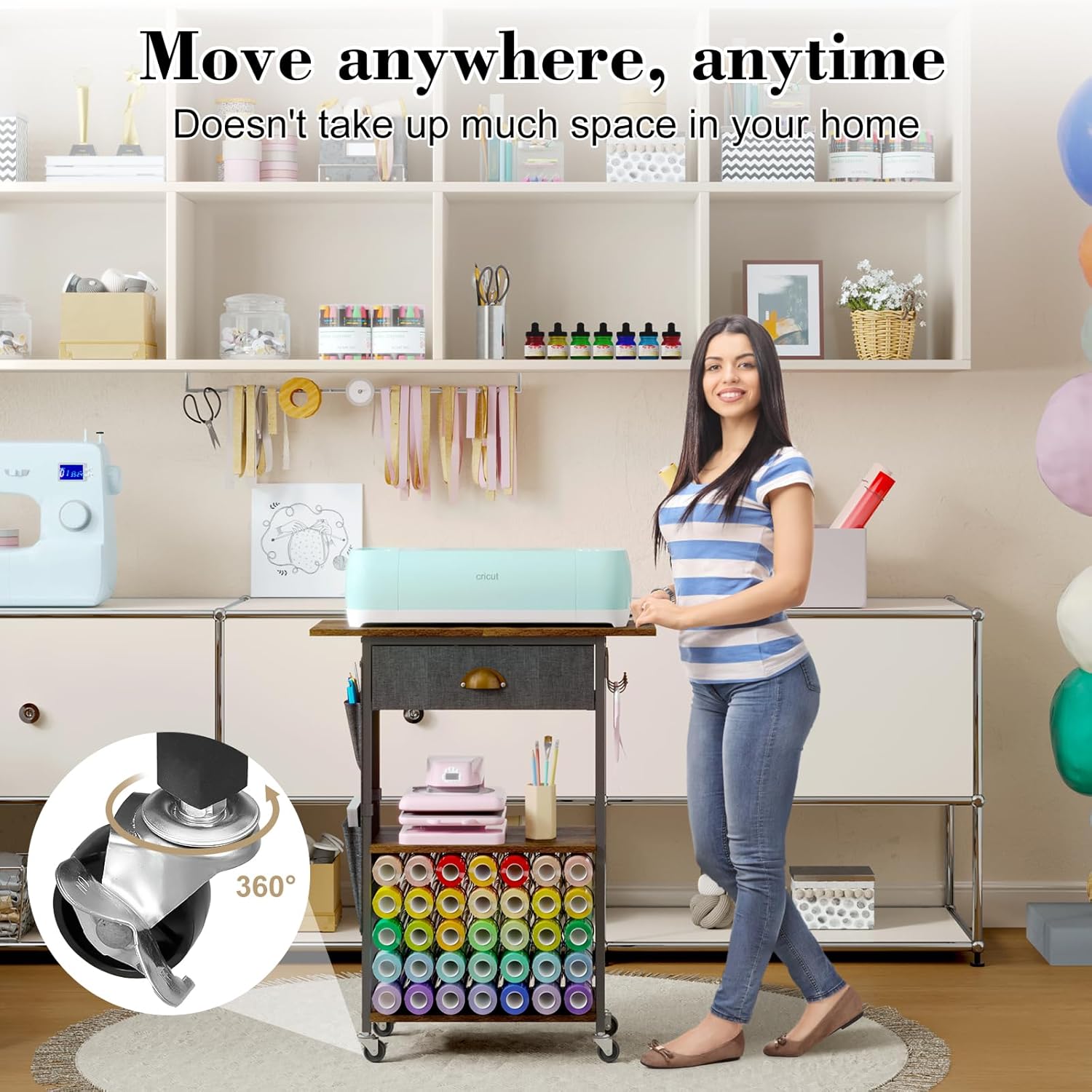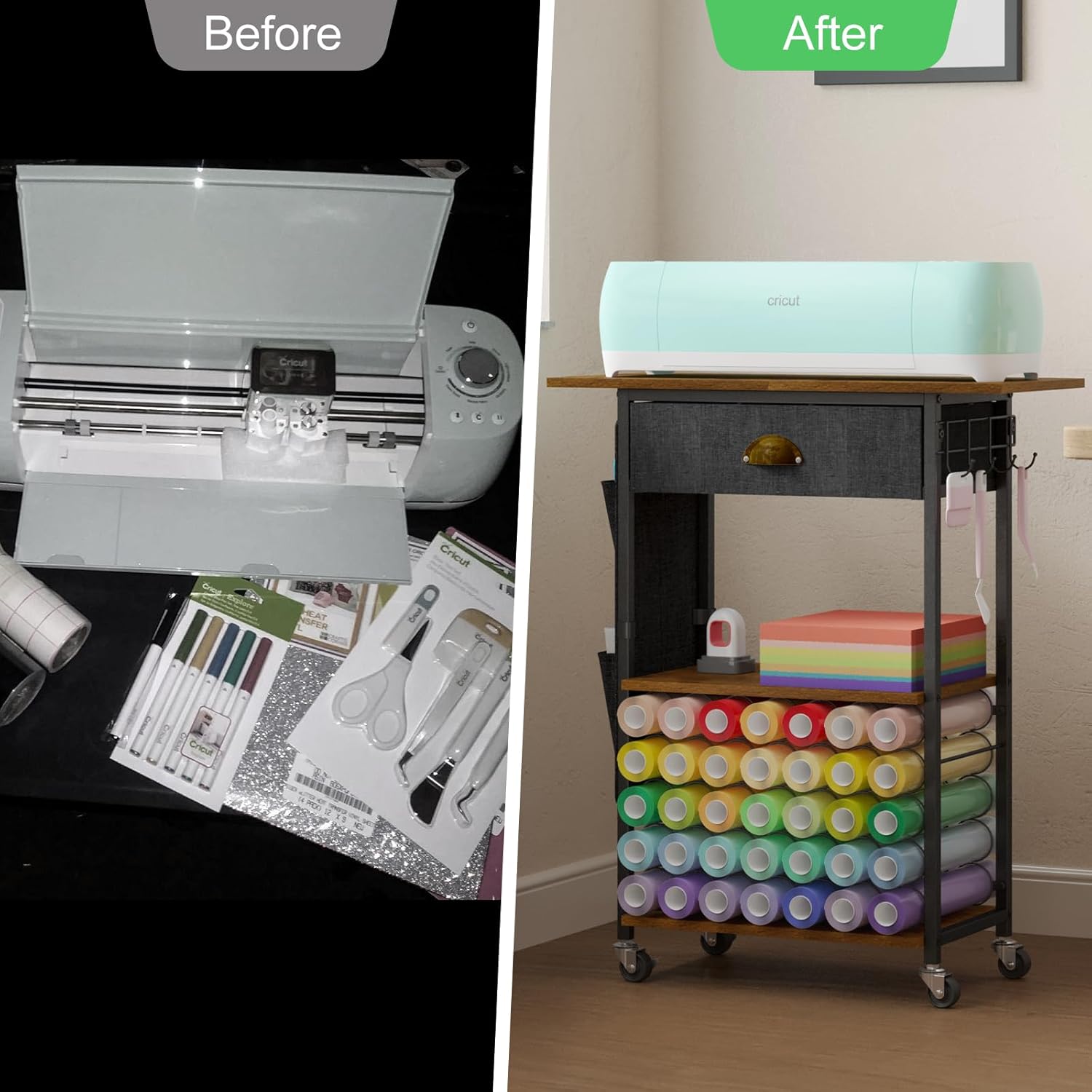 I absolutely love the Lyuwanxian Craft Organizer and Storage Cart! It’s the perfect companion for my Cricut machine. The top shelf fits the Cricut Maker beautifully, while the drawer and side hooks keep all my tools neatly organized and within reach. I especially love the spacious vinyl roll slots—it fits all my colorful rolls and keeps them visible and tidy. The shelves are strong enough to hold cardstock, cutting mats, and even my mini heat press.The fabric pockets on the side and back are perfect for storing pens, scissors, and coloring books. It’s on wheels, so I can move it around easily in my craft room. Stylish wood and black metal design makes it look high-end too. Assembly was simple and quick.