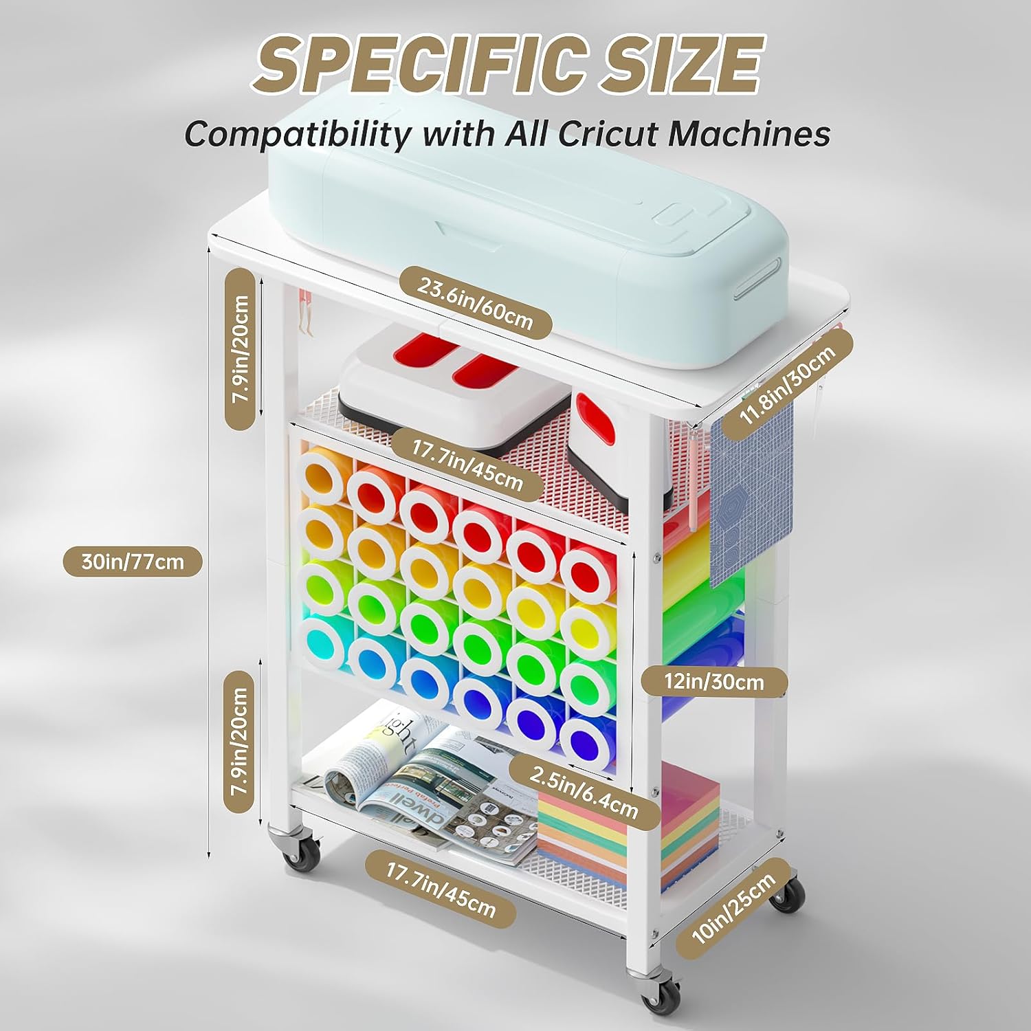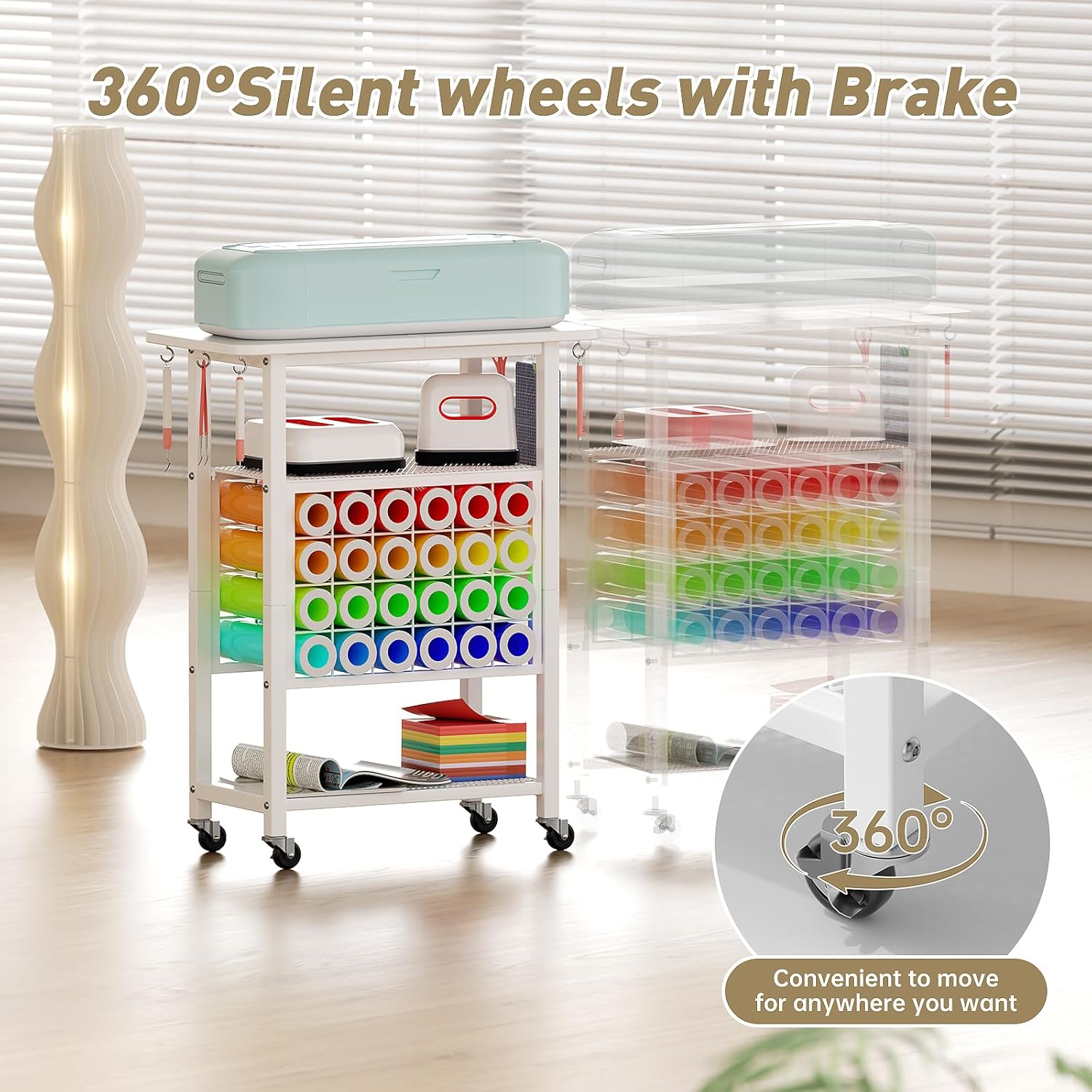 Ample Storage Stand: Designed specifically for Cricut machines and tools, this craft storage cart offers ample storage space to keep your craft materials neatly organized and easily accessible. The top shelf is perfect for placing your Cricut machine, 24 compartments for vinyl rolls, and can neatly store all your rolls of vinyl, and the six hooks offer convenient hanging space for frequently used tools