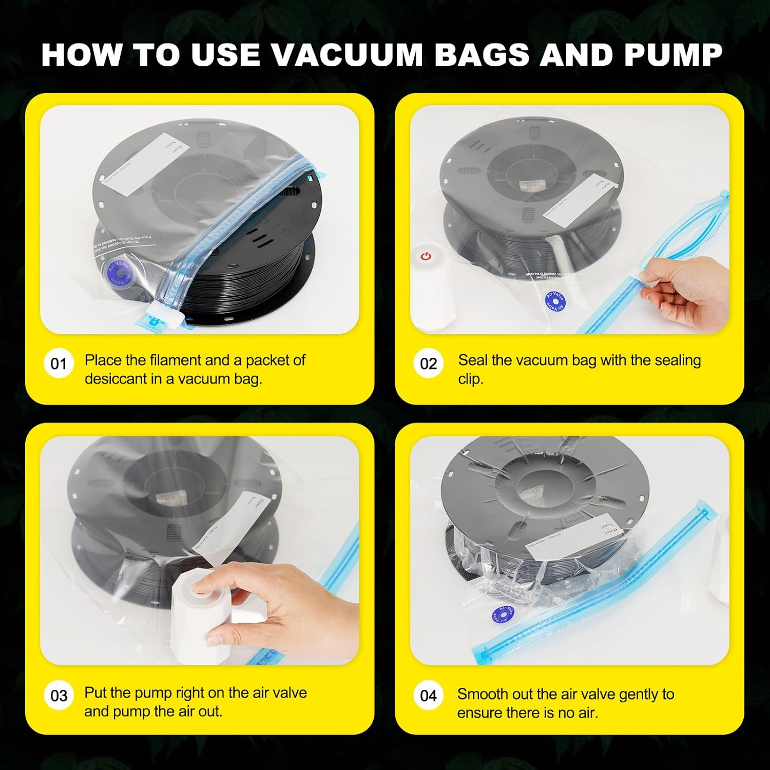 Each set comes with 30 filament storage bags and vacuum pump, which can be sealed in seconds to protect against moisture and dust.