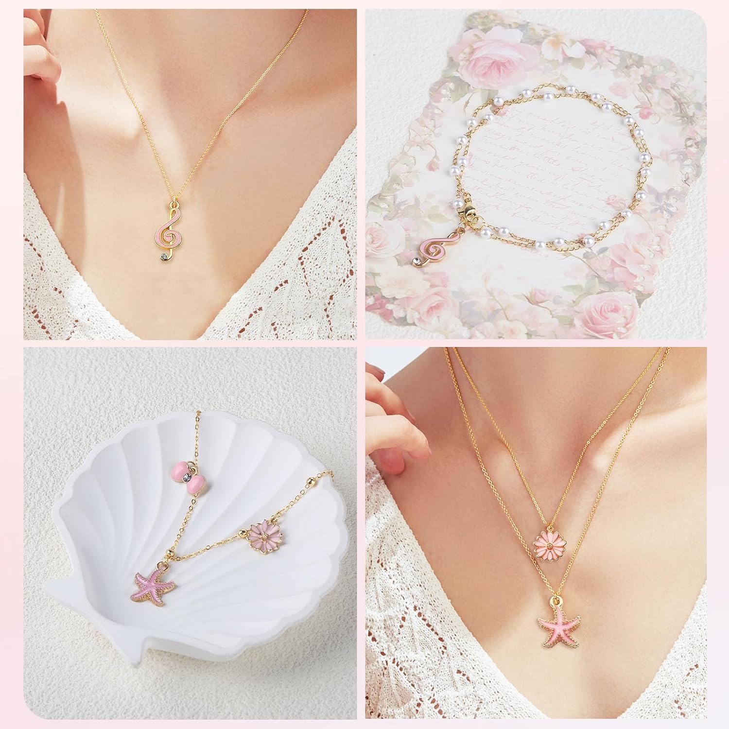 Everything you need to start your jewelry journey: 5 styles of 18K gold-plated necklace chains for jewelry making, 100 jump rings, 20 lobster clasps, 50 gold pendants, 50 colorful pendants, 26 letter pendants, 10 pearl pendants, 2 precision pliers, and a convenient storage bag