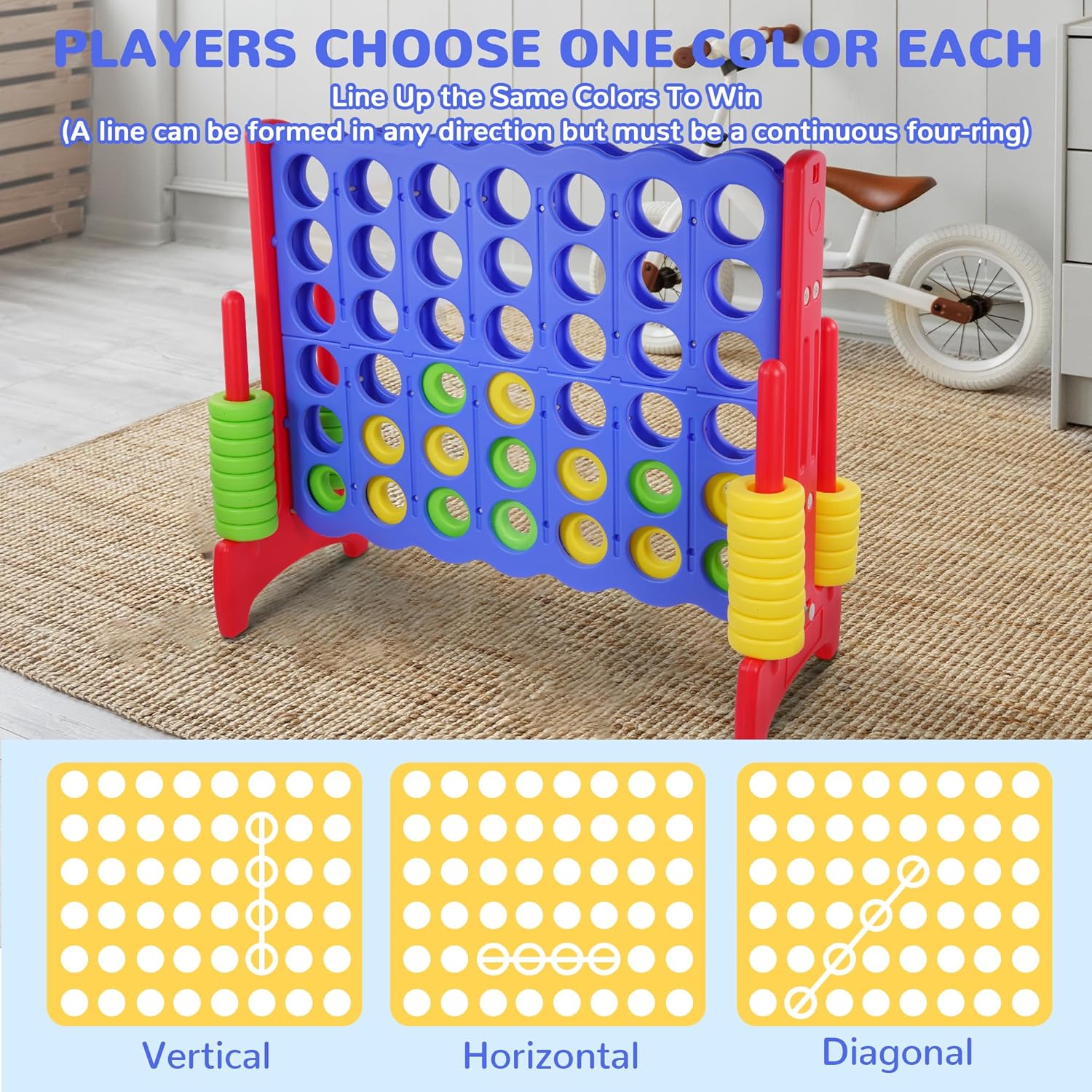 【4-To-Score Game】Bring excitement to any occasion with our Jumbo 4-in-A-Row giant game set. The winner is to be the first player to connect four of your colored discs in a row, either horizontally, vertically, or diagonally.