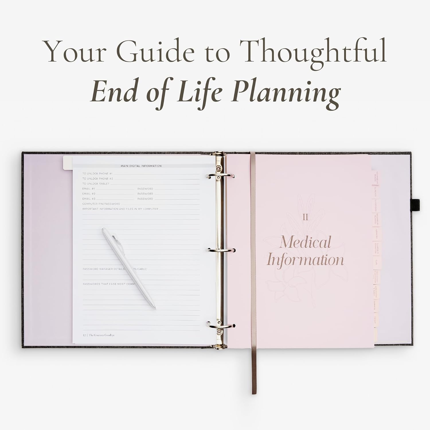 𝗖𝘂𝘀𝘁𝗼𝗺𝗶𝘇𝗮𝗯𝗹𝗲, 𝗔𝗱𝗮𝗽𝘁𝗮𝗯𝗹𝗲 𝗕𝗶𝗻𝗱𝗲𝗿 𝗦𝘆𝘀𝘁𝗲𝗺 – Unlike traditional notebooks, the Gracious Goodbye planner features a flexible binder system, allowing pages to be added, removed, or replaced as your needs change—ensuring long-term functionality and personalization.