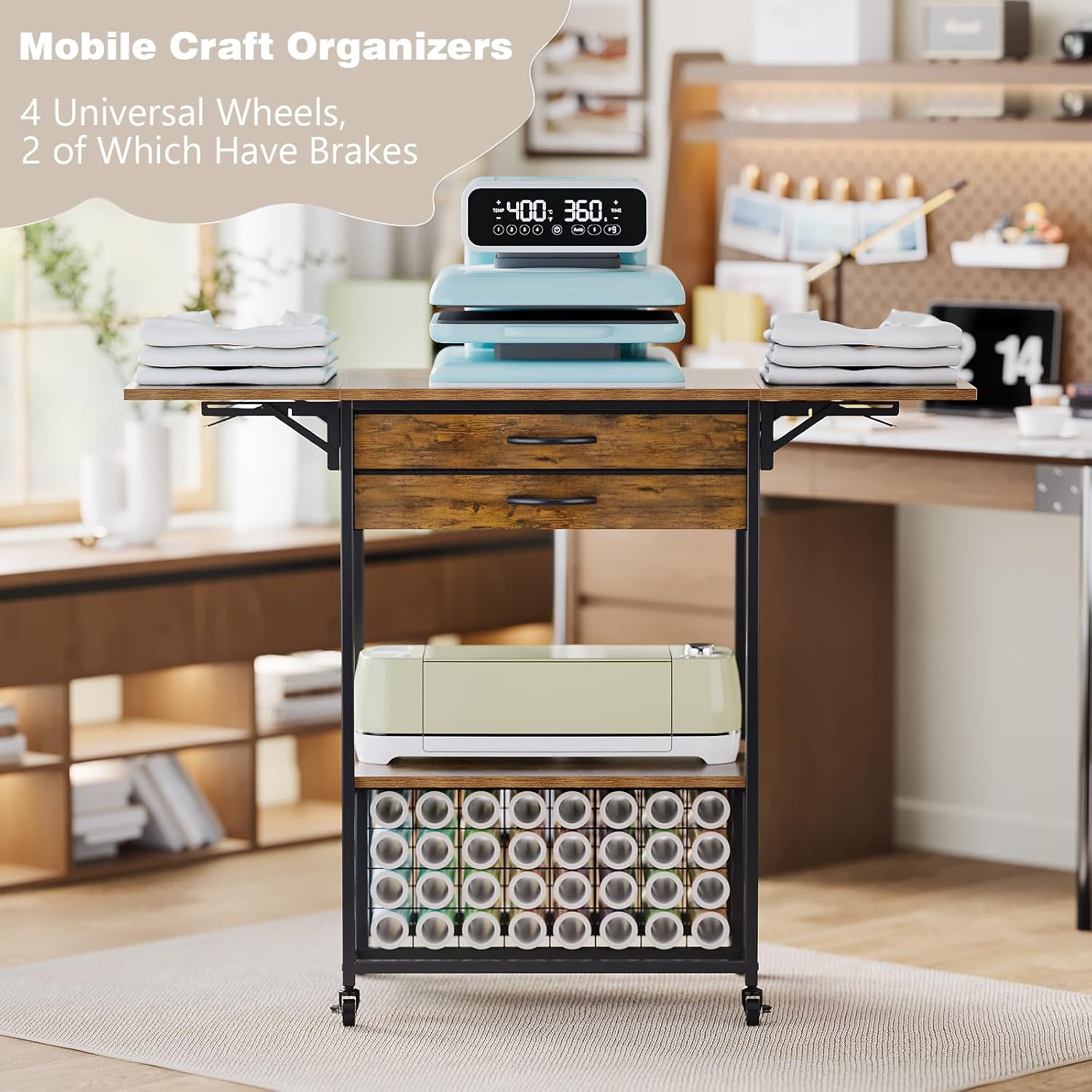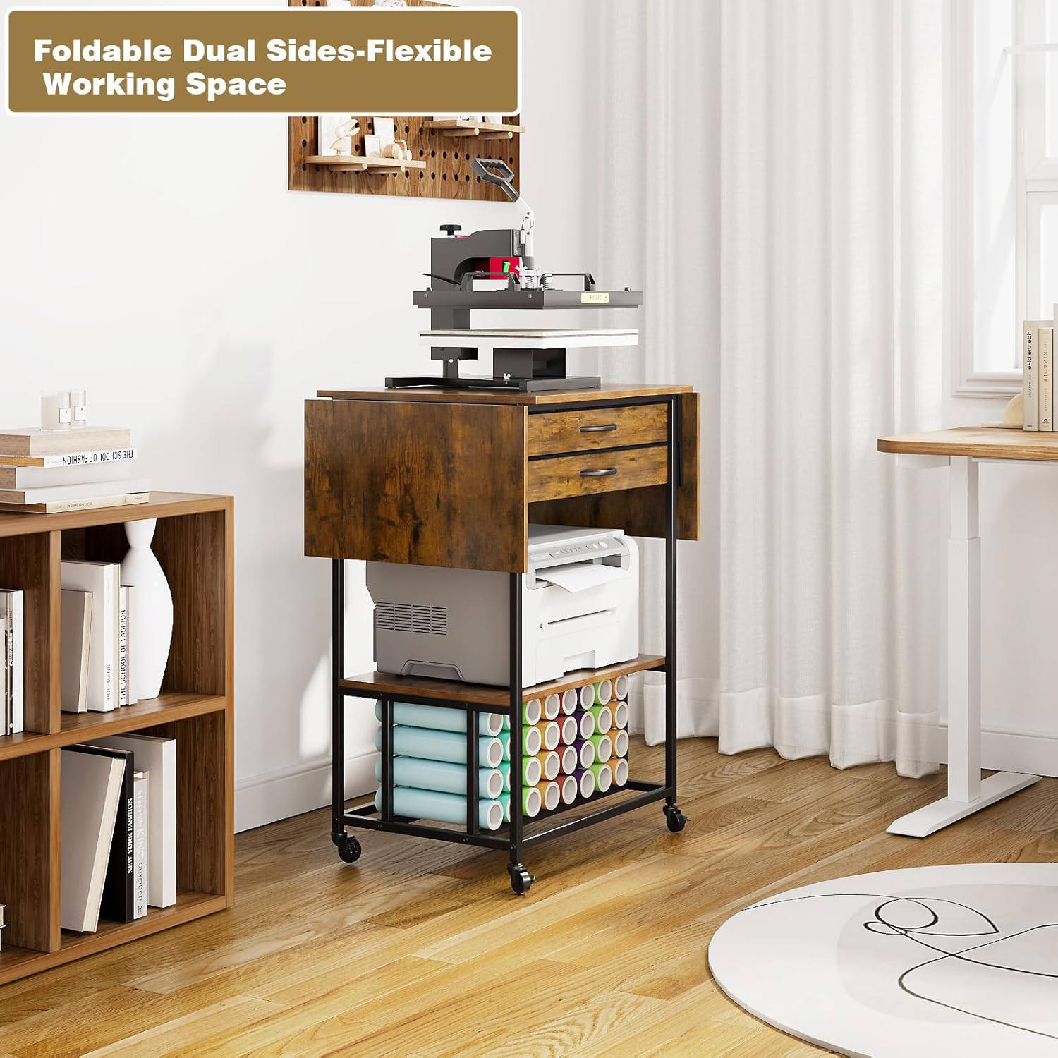 Foldable Heat Press Table Stand, Movable Rolling Heat Transfer Machine Cart with 2 Storage Drawers Compatible with Cricut Vinyl Roll Holder DIY Crafting Table Workbench (Rustic Brown)