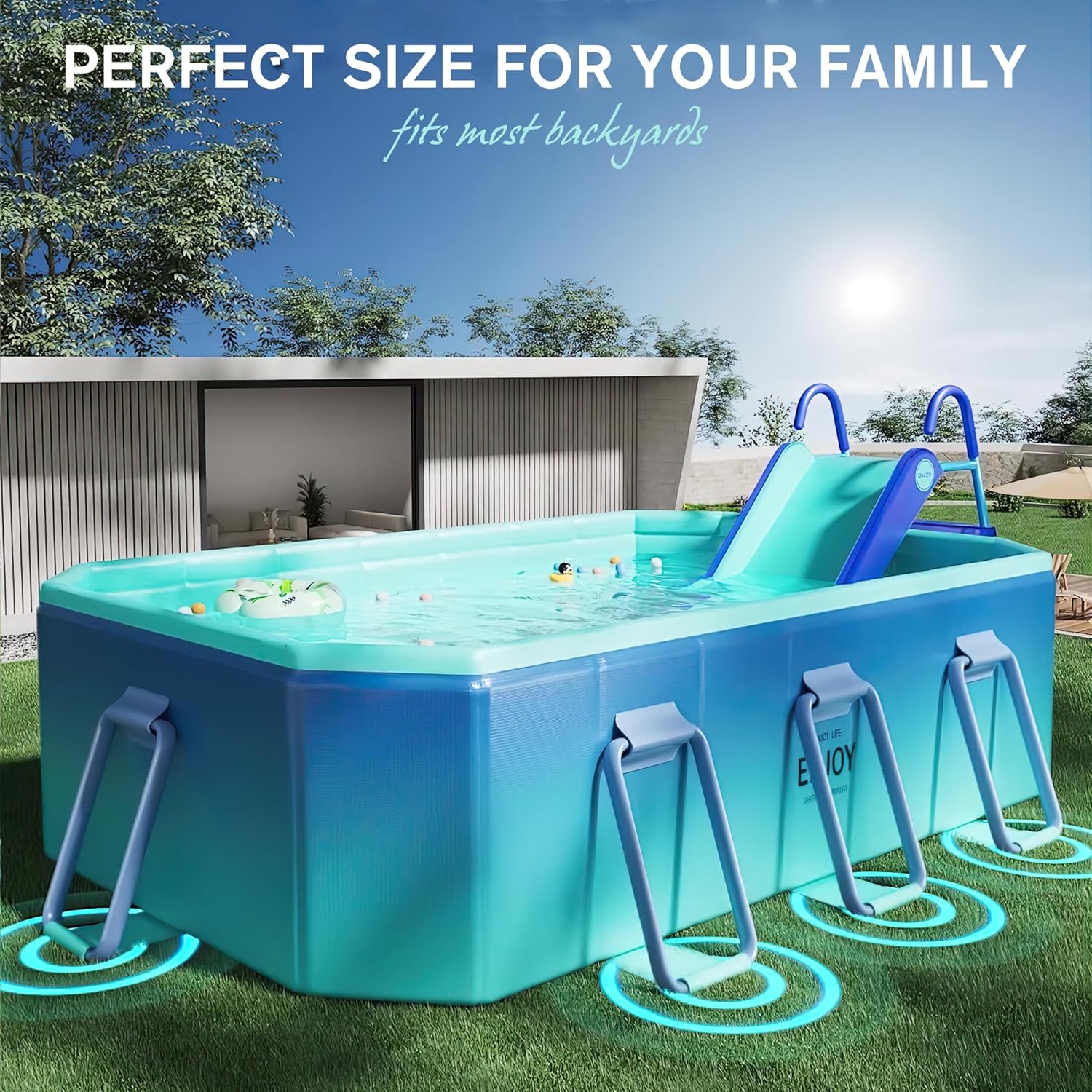 Quick Setup, No Inflation Needed: This non-inflatable pool features a foldable design that makes setup simple—just unfold, add water, and it’s ready to use. With no pump or extra tools needed, it’s a convenient option for families looking for easy backyard fun