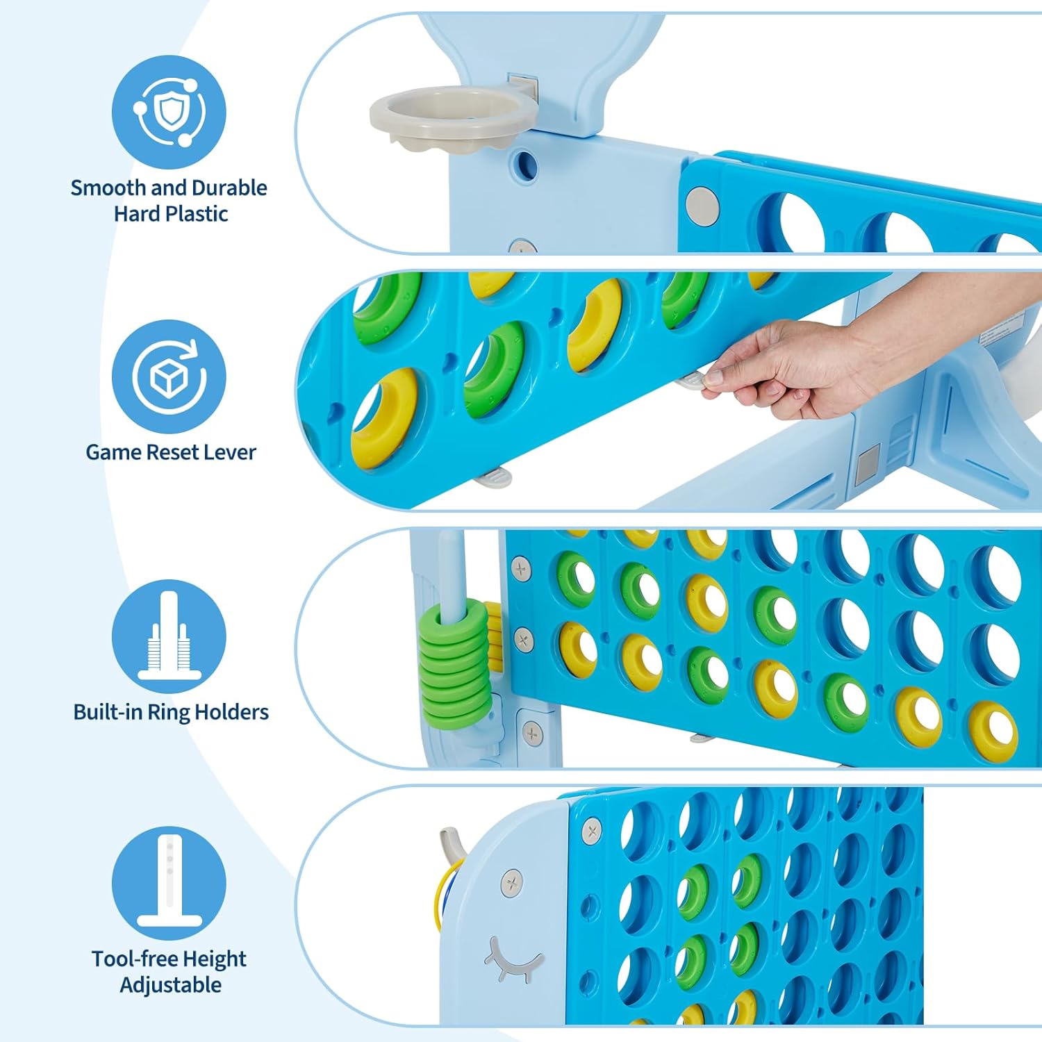 This giant 4-in-a-row game is an absolute hit for family gatherings, parties, and backyard fun. The adjustable four-level height design makes it great for all ages — kids can play comfortably at the lower settings, while adults enjoy a full-size game experience when it’s extended. The pieces are large, brightly colored, and easy to handle, making it as entertaining as it is eye-catching. The quick-release slider at the bottom makes resetting the game fast and simple, keeping the action going without interruption.The construction feels durable and well-made. The frame is sturdy and stable, holding up well on grass, pavement, or indoor floors without tipping. The smooth edges and rounded corners make it safe for kids, and the plastic discs are thick enough to withstand plenty of play without bending or cracking. The colors stay vivid even after extended outdoor use, and the entire setup resists scuffs and fading.Assembly is quick and straightforward — everything clicks together securely, and it disassembles just as easily for storage or transport. After several weekends of use, it still looks brand new and performs perfectly. Compared to smaller tabletop versions, this jumbo set adds excitement and visibility, making it a fun centerpiece for parties or casual competitions.If there’s one small improvement that could make it even better, adding a small carrying case or handle would make transport easier between events. Still, it’s lightweight enough to move by hand when needed.Overall, this jumbo 4-in-a-row game is sturdy, vibrant, and endlessly fun — a perfect mix of family-friendly entertainment and durable design that guarantees laughter and friendly competition wherever it’s set up.