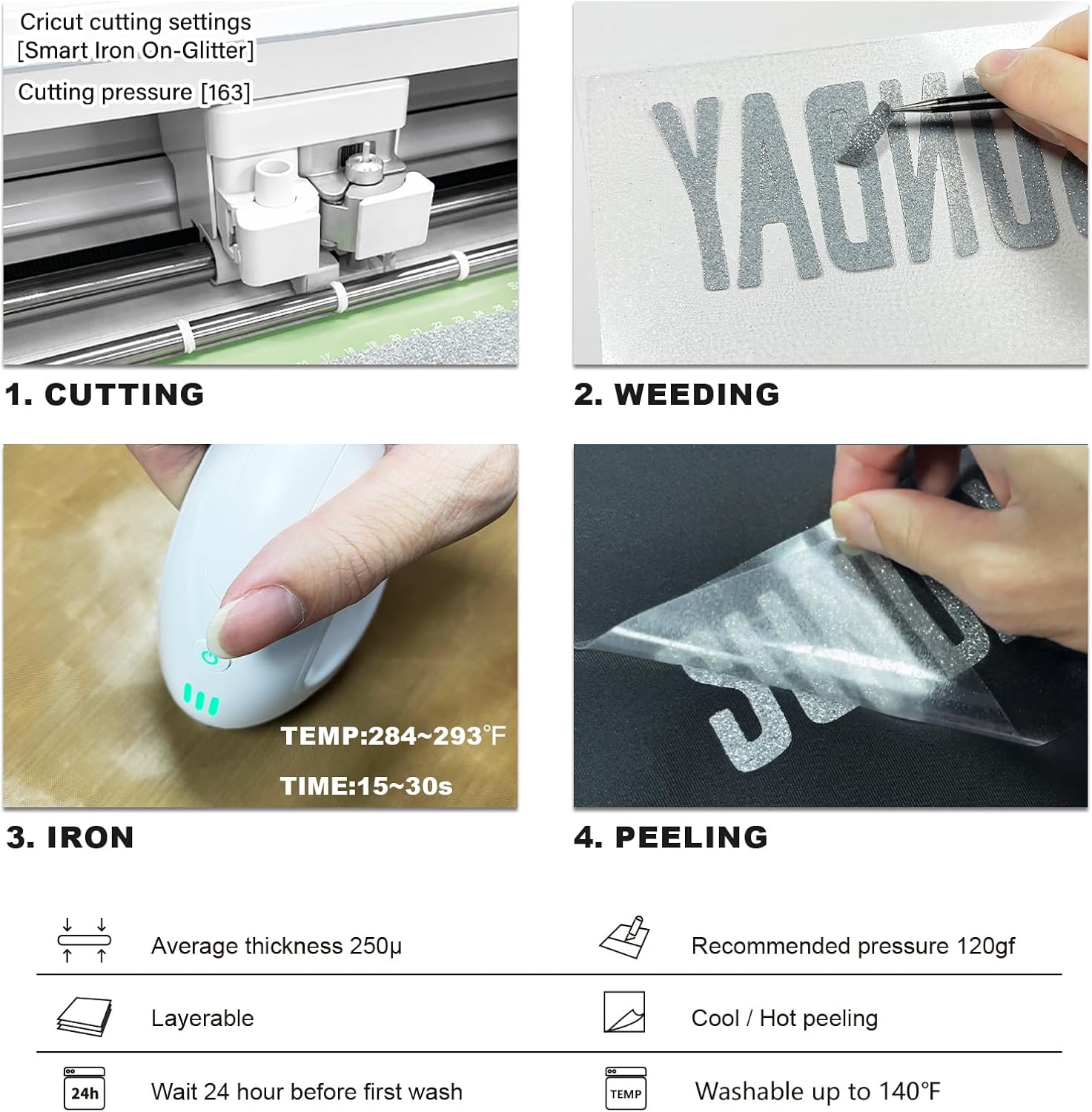 【Easy to Cut and Weed】This iron-on vinyl is easy to cut and weed. Average thickness 250μ, recommended pressure 120gf, layerable, cool peeling, designed for heat transfer projects. Simply follow the recommended temperature of 275℉—293℉ and press time of 15-30 seconds