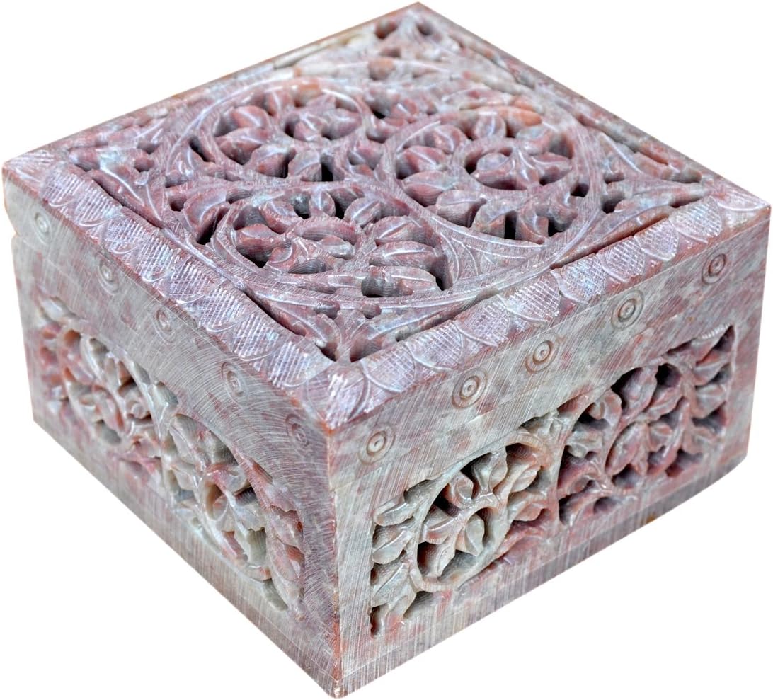 Dimensions :: L x W x H :: 4 x 4 x 2 Inch, (10.16 x 10.16 x 5.08 cms) Weight :: 660 Grams (1.45 lbs) | Material :: Soapstone | Made in India HandicraftThis stash box is a good choice for your dressing table, living room or bedroom side table, kitchen counter, home office, dorm room essentials, dining, hotel, restaurant, makeup desk organizer, etc.