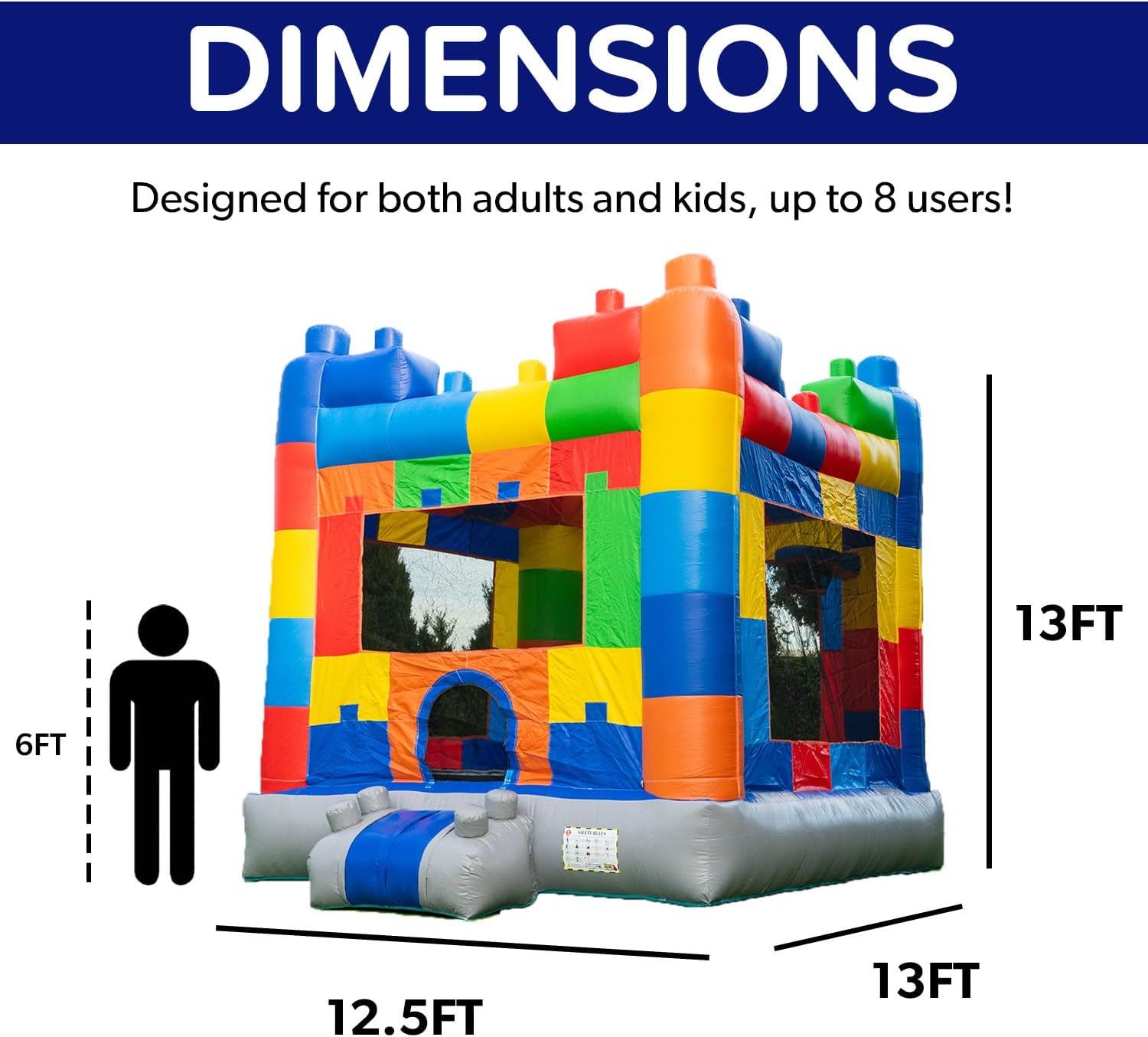 SPACIOUS BOUNCER DESIGN: Measuring 12.5’x13’x13’ the bounce house offers a spacious jumping area for both kids and adults, with a built-in basketball hoop for instant jumping fun and joy.