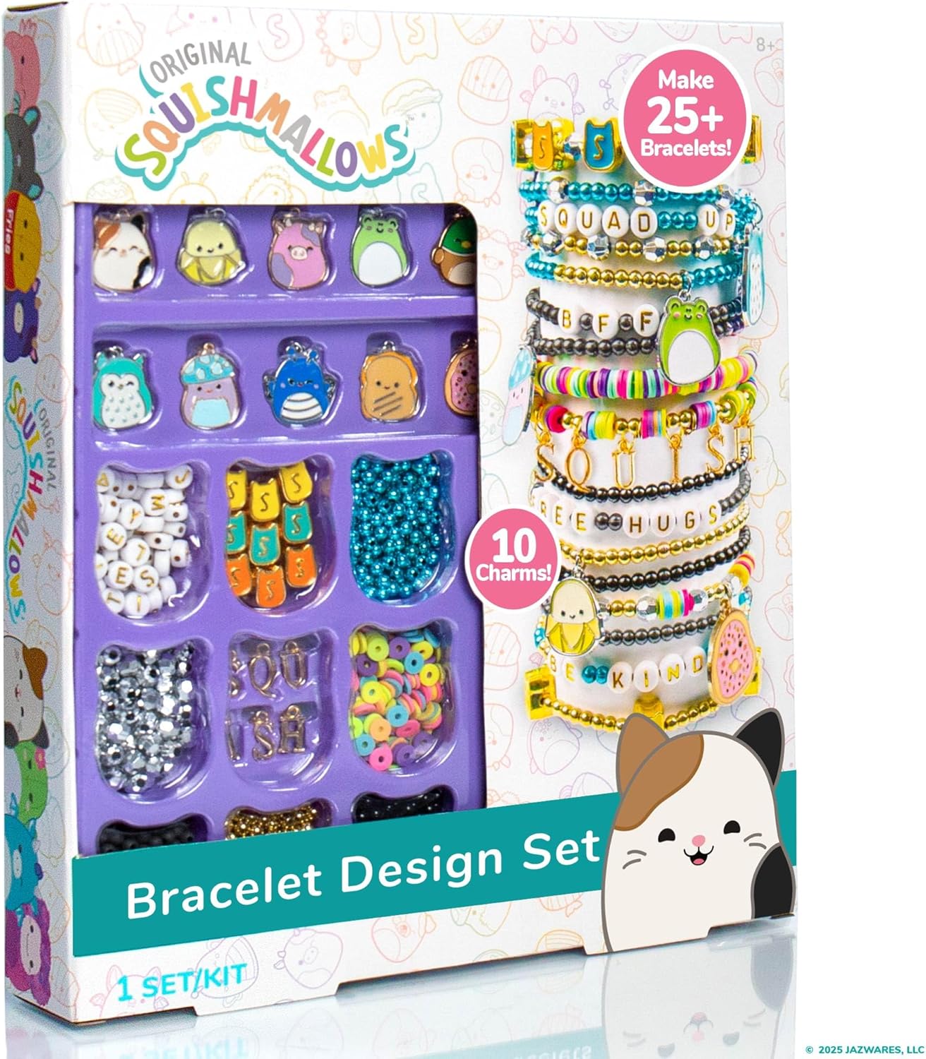 Squad Up and create custom accessories with the Original Squishmallows Bracelet Design Set! Packed with over 1,000 pieces, from beads and cording to charms of your favorite Squishmallows, this kit has everything you need to make 25+ bracelets. Mix and match durable enamel charms with a rainbow of stackable polymer beads, spell out your style with dangling letter charms, double the ’Mallow magic with trendy slider charms and sparkly faceted beads — the creative possibilities are endless! Ideal for all skill levels, the project guide ensures anyone can Join the Squad and design custom accessories. With plenty of materials, this kit is perfect for sleepovers, a Squishmallows birthday party, or small group crafts. Recommended for Squishmallows fans age 6 and up!