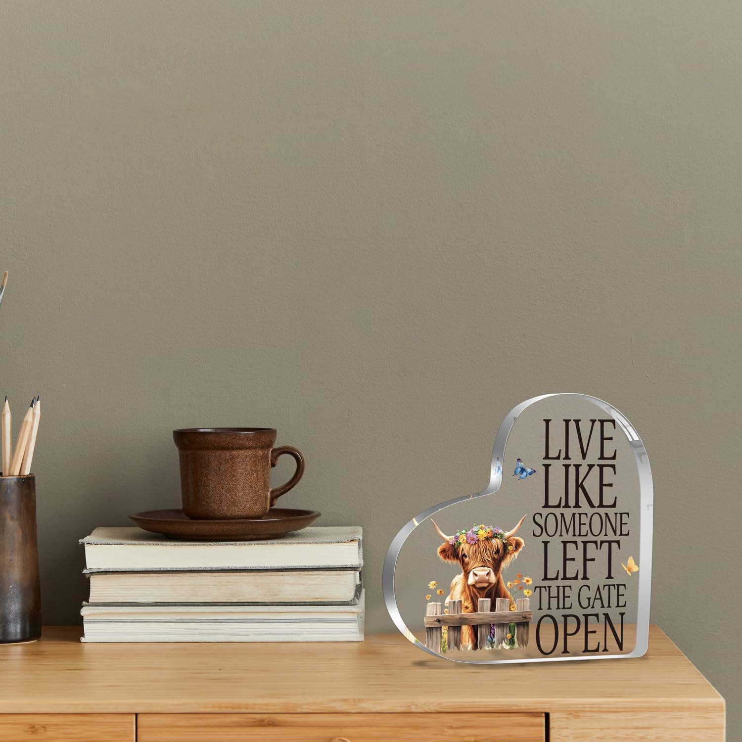 Inspirational Highland Cow Gifts for Women, Live Like Someone Left The Gate Open Acrylic Sign Cow Decorations for Home Farm Bathroom Bedroom Decor, Motivational Decor Sign Gifts for Friends Coworker
