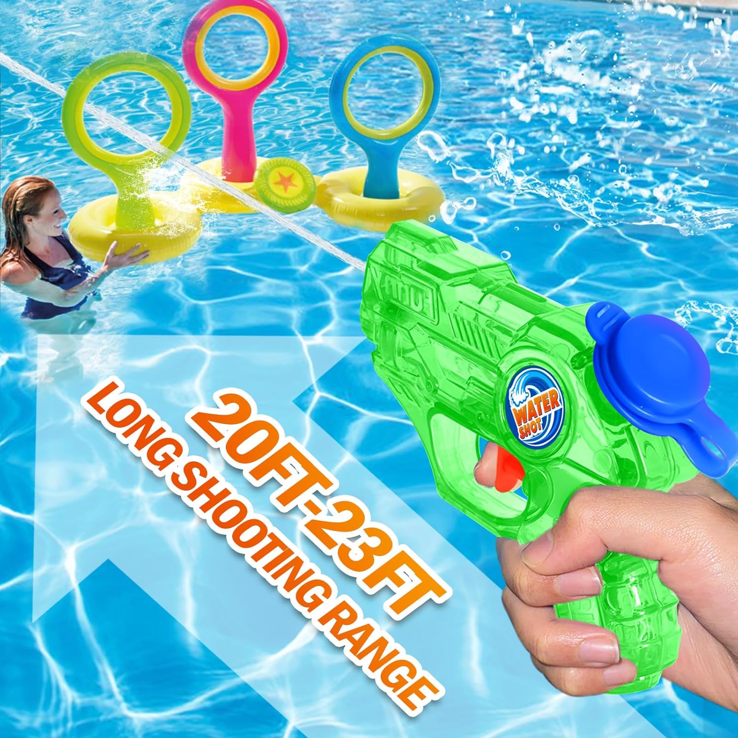 Water Capacity: Hold up to 6.8 fl oz (200CC) Water. Shooting range up 20-23ft. Easy to refill during play. The reinforced sealing design can prevent water leakage during use. Not with battery power, Safer for Kids Than the Electric Water Guns.