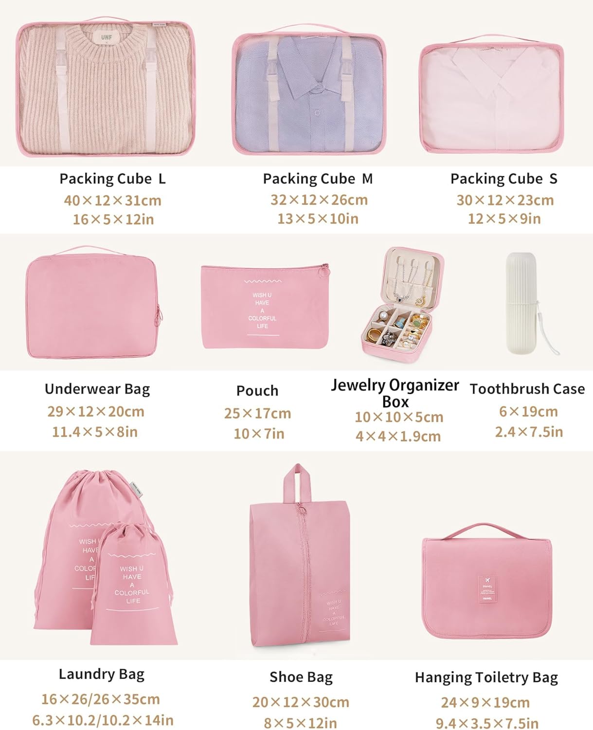 🛫【Multi-Functional Packing Cubes 11 Set】Packing Cubes * 3; Underwear Bag * 1; Laundry Bag * 2; Upgraded Shoe Bag * 1; Hanging Toiletry Bag * 1; Waterproof Pouch * 1; Jewelry Organizer Box * 1; Travel Toothbrush Holder * 1. Large capacity must-have value pack.