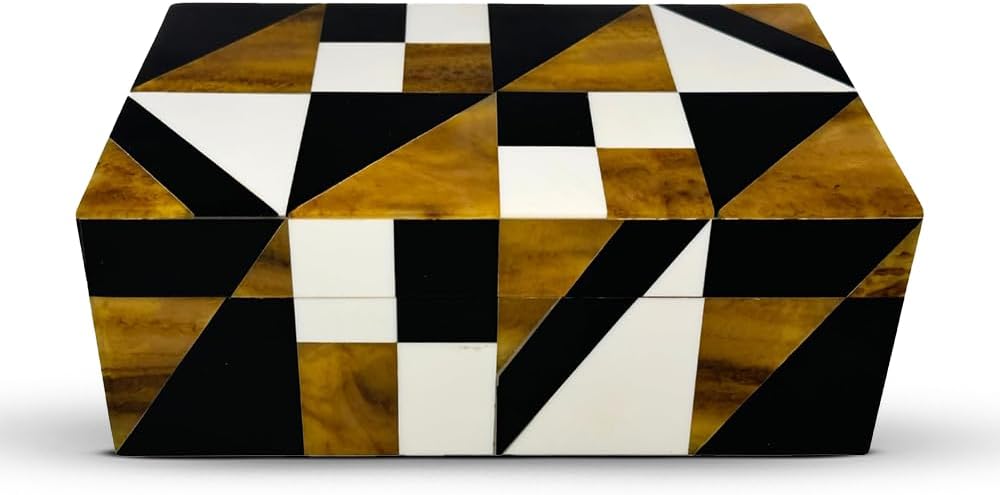 Compact & Convenient: Enhance your home decor with the Perilla Home Decorative Wooden Geomatric Keepsake Box, an exquisite piece in Brown, blackand off white tones. Crafted with precision, this 8″x5″x3″ storage box combines functionality and beauty, making it perfect for storing jewelry, keepsakes, and other small treasures. Its timeless design seamlessly complements any room, while its durable wooden construction ensures long-lasting use. A thoughtful gift for all occasions, this decorative storage box adds a sophisticated touch to your living space.