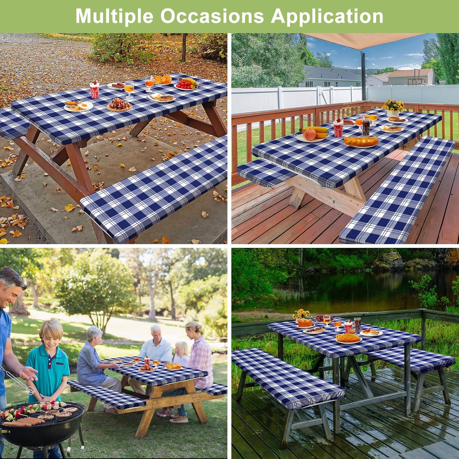 【WATERPROOF & WRINKLE FREE】Our fitted picnic table and bench covers made of high density waterproof fabric, which is wear-resistant, anti-wrinkle and anti-oxidation, long lasting for use. Inner lined with waterproof film, enable both sides liquid proof to keep the tables and benches under it clean, also easy to wipe out water, oil, coffee, milk, wine, juice, sauce.