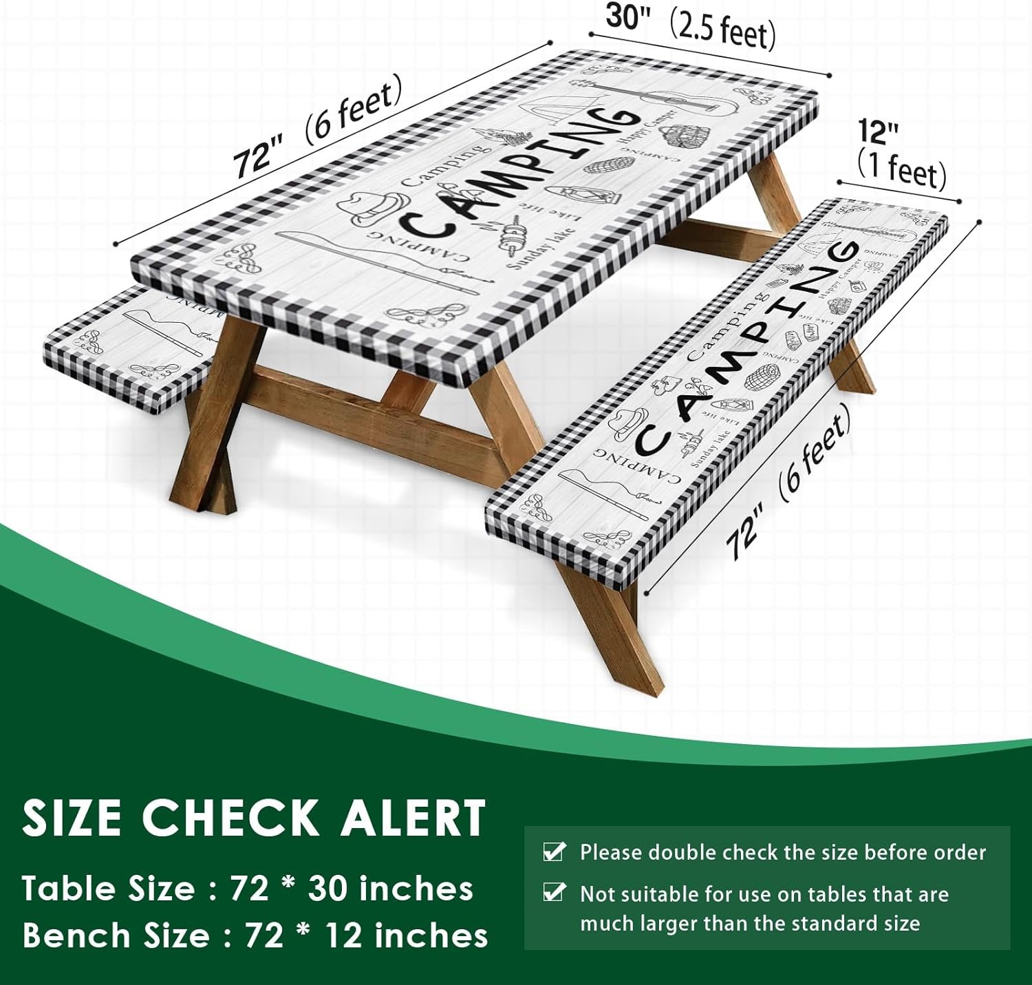 Picnic Table Cover with Bench Covers Elastic Edges, Farm Plaid Fitted Table Cover, Outdoor Patio Camping Essentials 72 Inch 3PCS, Waterproof Camping Fitted Tablecloth with Drawstring Bag