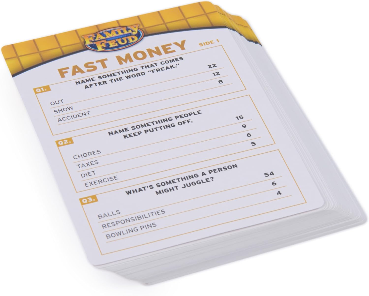 Includes: 150 Face Off Question Cards, 50 Fast Money Cards, 1 Steve Harvey Card, 1 Dry Erase Scoreboard, 1 Dry Erase Marker, Instructions