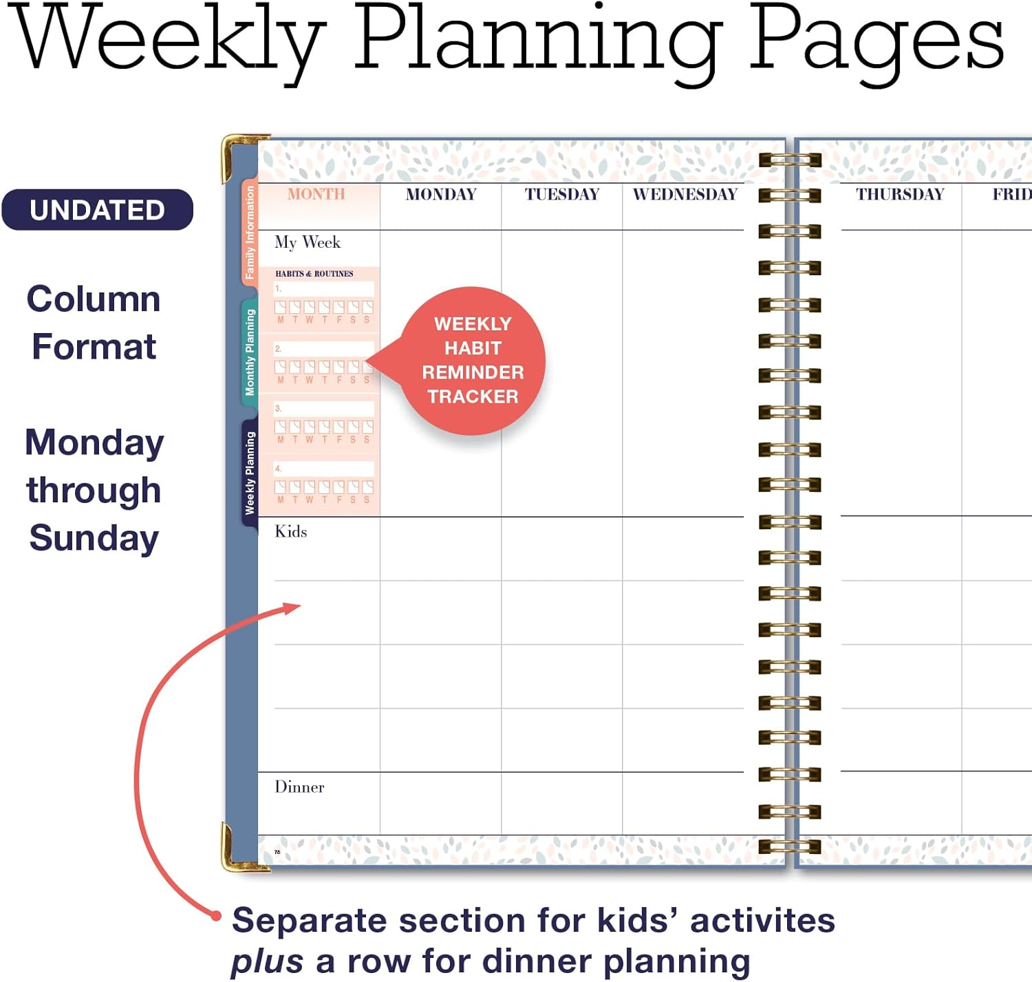THE IDEAL FAMILY ORGANIZER – Flexible undated weekly and monthly layouts with designated spaces for each family member’s activities and a collective meal-planning row—starts whenever you choose.