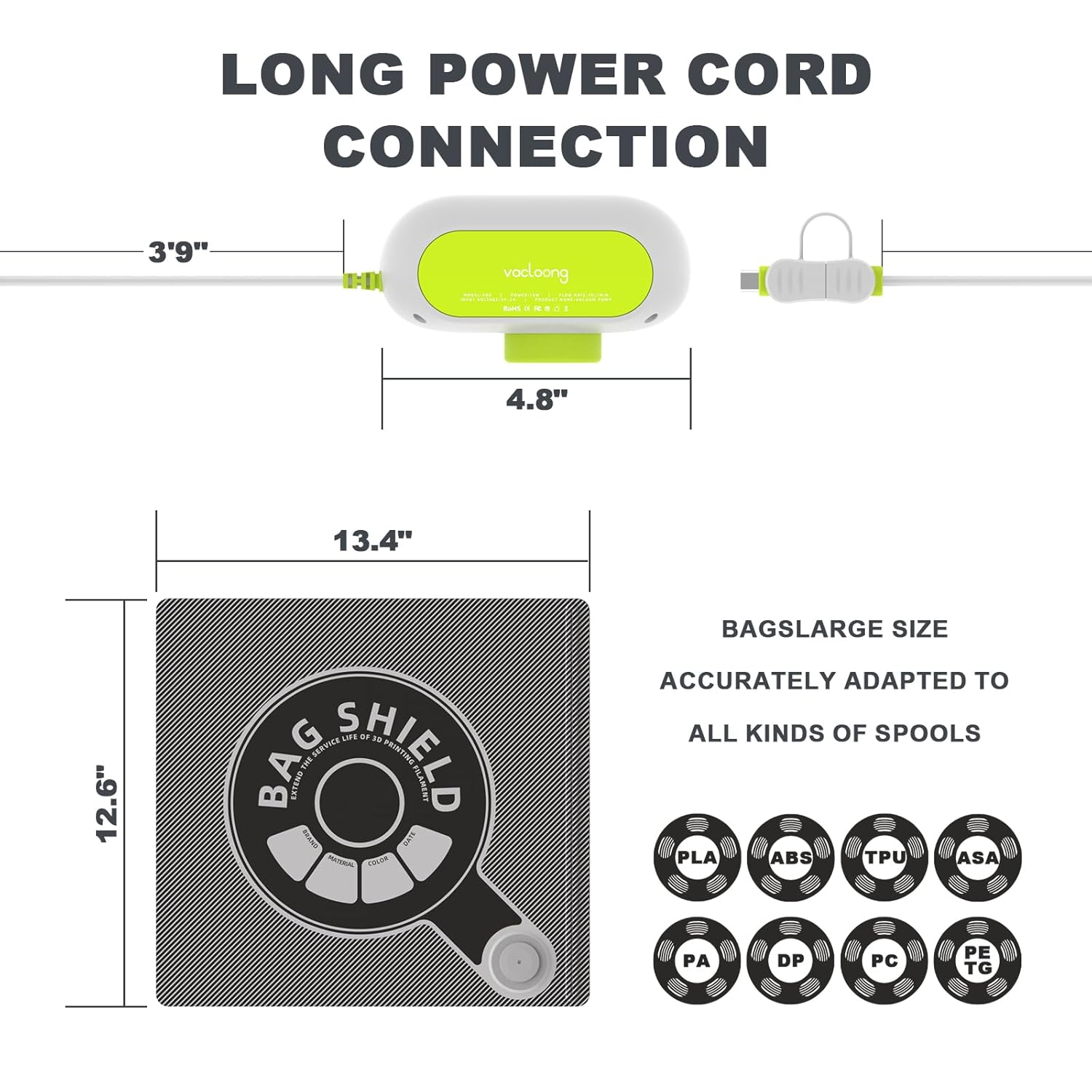 10L/M Ultra-Strong Suction & -60KPa Deep Vacuum: Vacloong filament storage bags kit achieves vacuum in seconds with <2% air residue, effectively prevent the oxidation of PLA/TPU/ABS/ASA/PETG/PC/PA/DP and other wires, extends storage life significantly.
