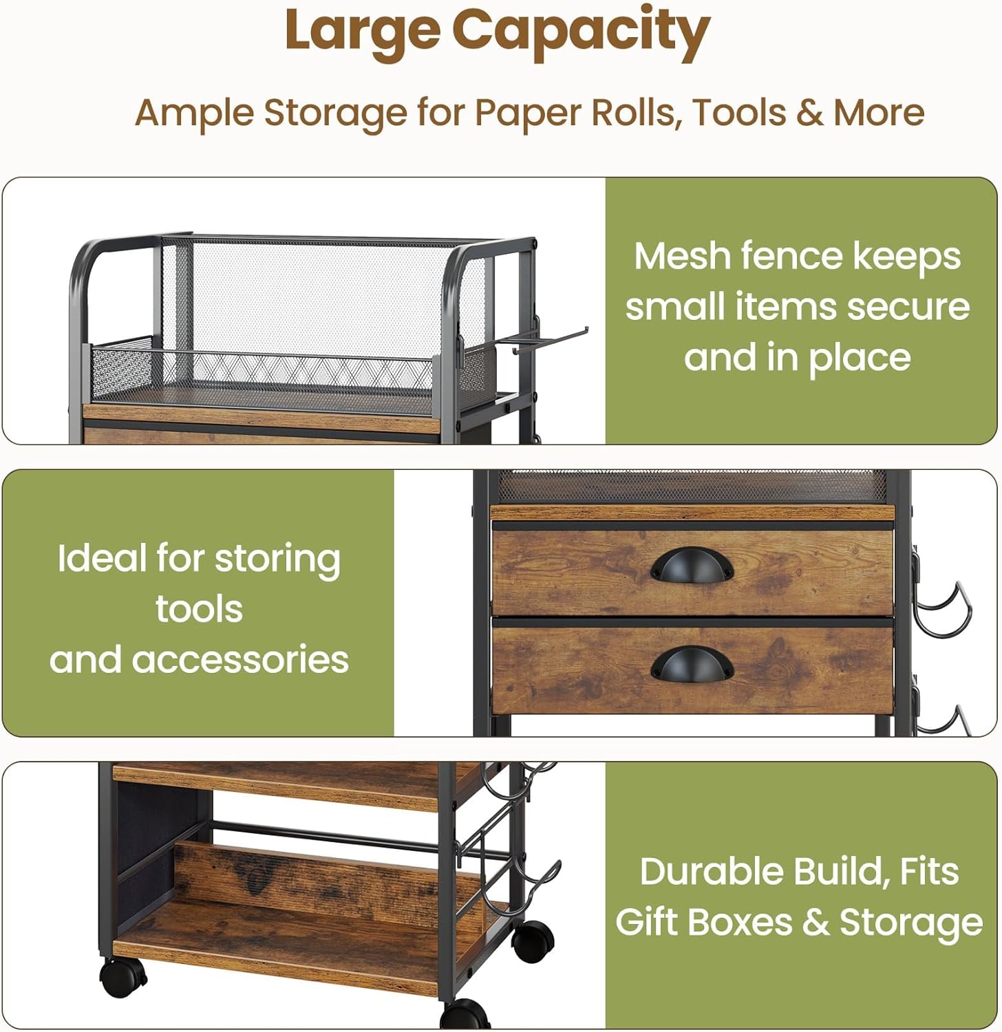【Durable Build & Smooth Mobility】Made with a quality wood tabletop and a carbon steel frame, this rolling craft cart is both stylish and built to last. It easily supports a variety of supplies. Four 360° swivel wheels make moving effortless, and two of them lock for stability. Whether you’re storing or transporting your wrapping tools, this cart stays sturdy and flexible.
