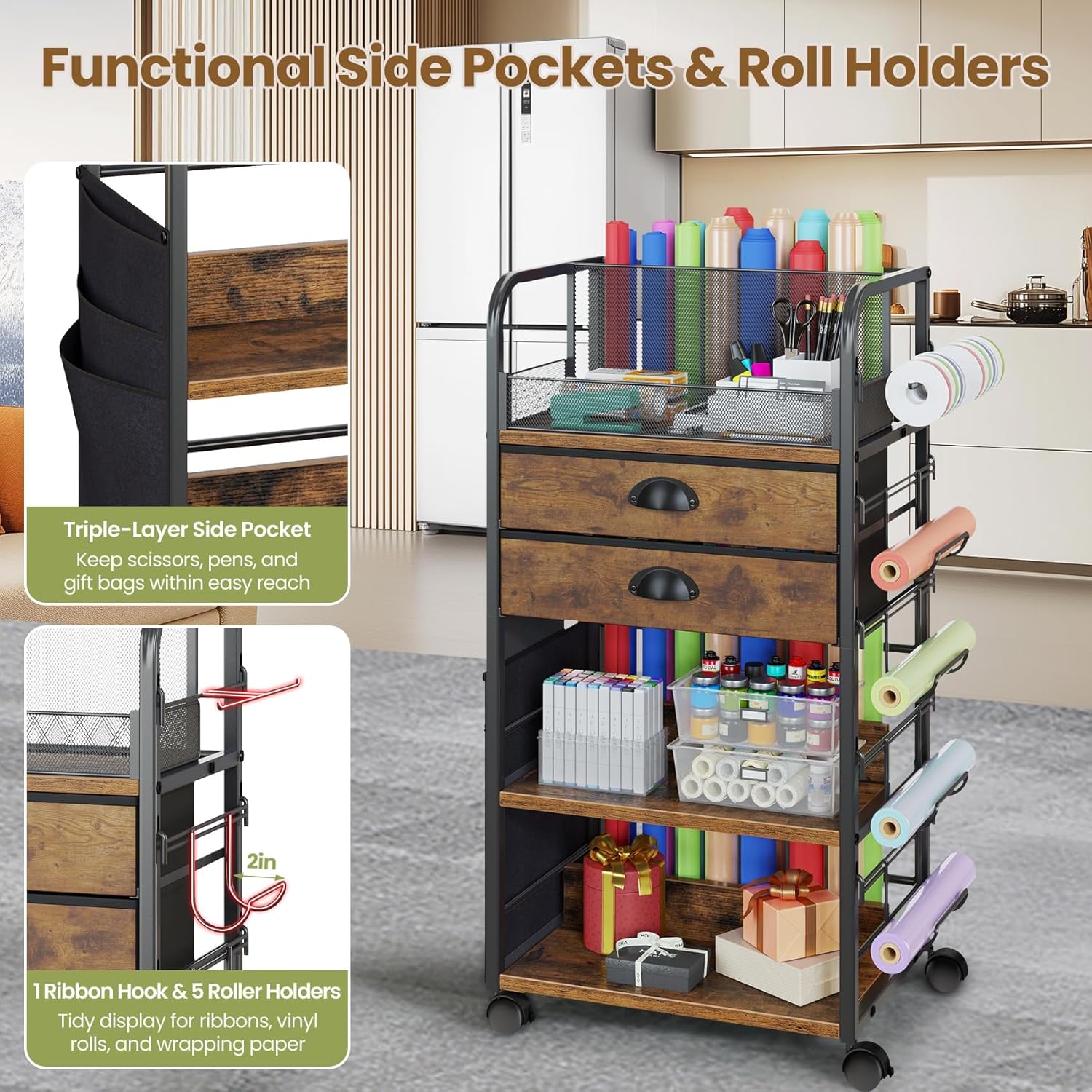 【Flexible Storage Solutions】This rolling craft cart isn’t just useful for birthdays or Christmas gift wrapping—it’s also ideal for storing scrapbooking materials, party supplies, beauty products, and more. Whether you’re organizing gift bags or vinyl rolls, it adapts to your needs while keeping everything tidy and accessible.